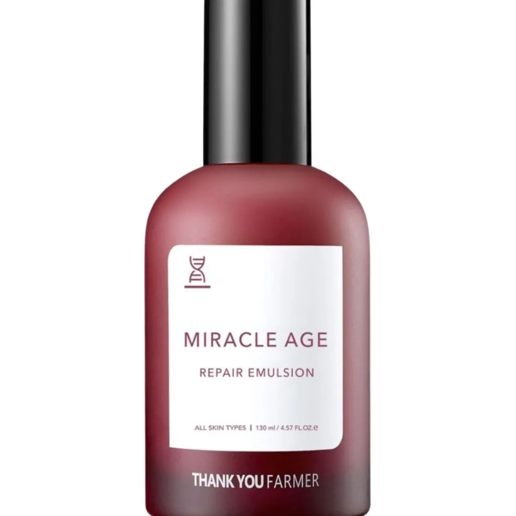 THANK YOU FARMER Miracle Age Repair Emulsion is een voedende en anti-aging moisturizer die de huidelasticiteit en stevigheid helpt verbeteren. Verrijkt met krachtige ingrediënten zoals propolisextract, peptiden en niacinamide, vermindert het de zichtbaarheid van fijne lijntjes en rimpels terwijl het de huid intens hydrateert. De lichte, niet-vette textuur trekt snel in en laat de huid zijdezacht, soepel en vernieuwd aanvoelen. Ideaal voor wie op zoek is naar een zachte maar effectieve oplossing voor een jeugdige en stralende huid.