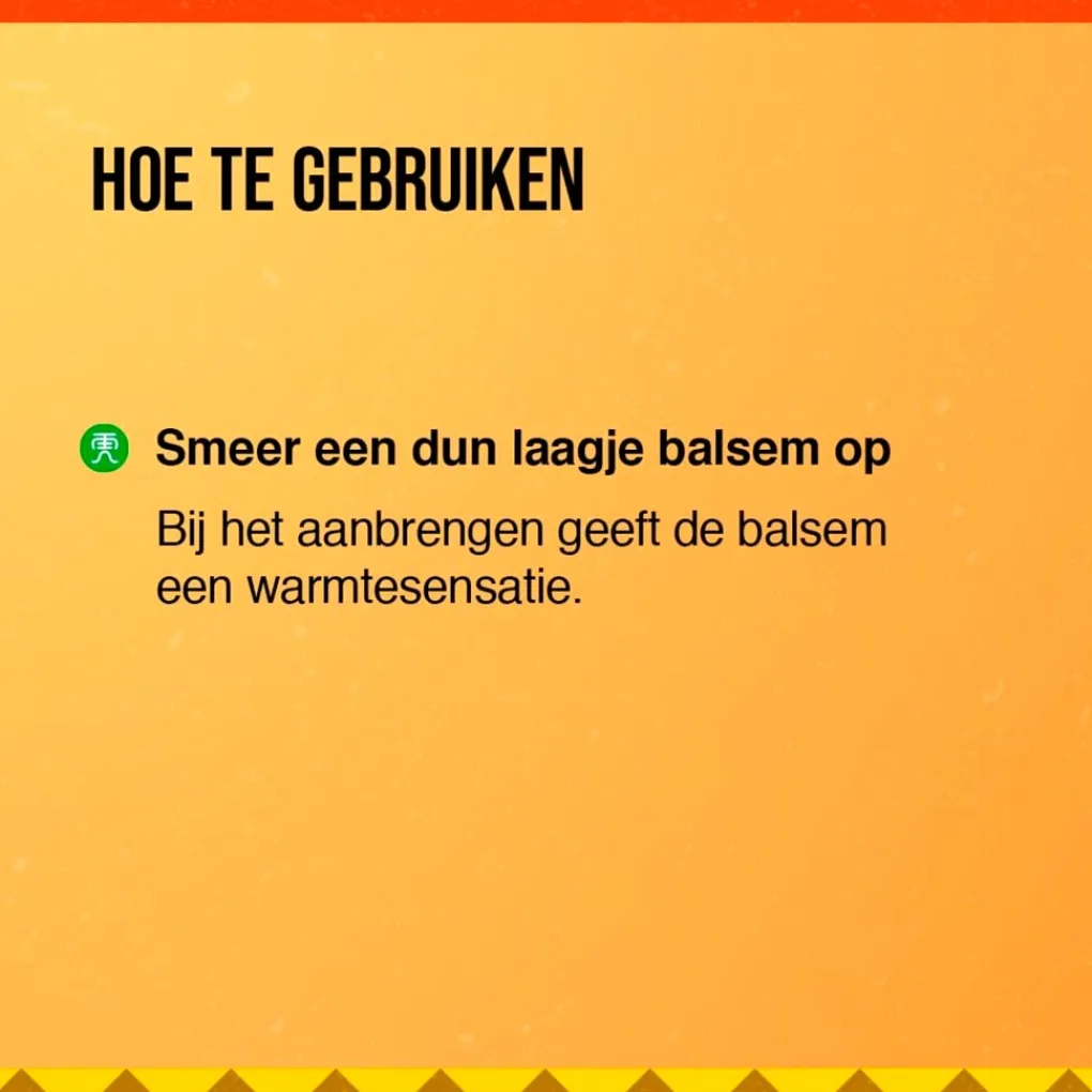 Smeer een dun laagje balsem op je huid. De balsem is geschikt voor uitwendig gebruik en bewaar buiten bereik van kinderen.