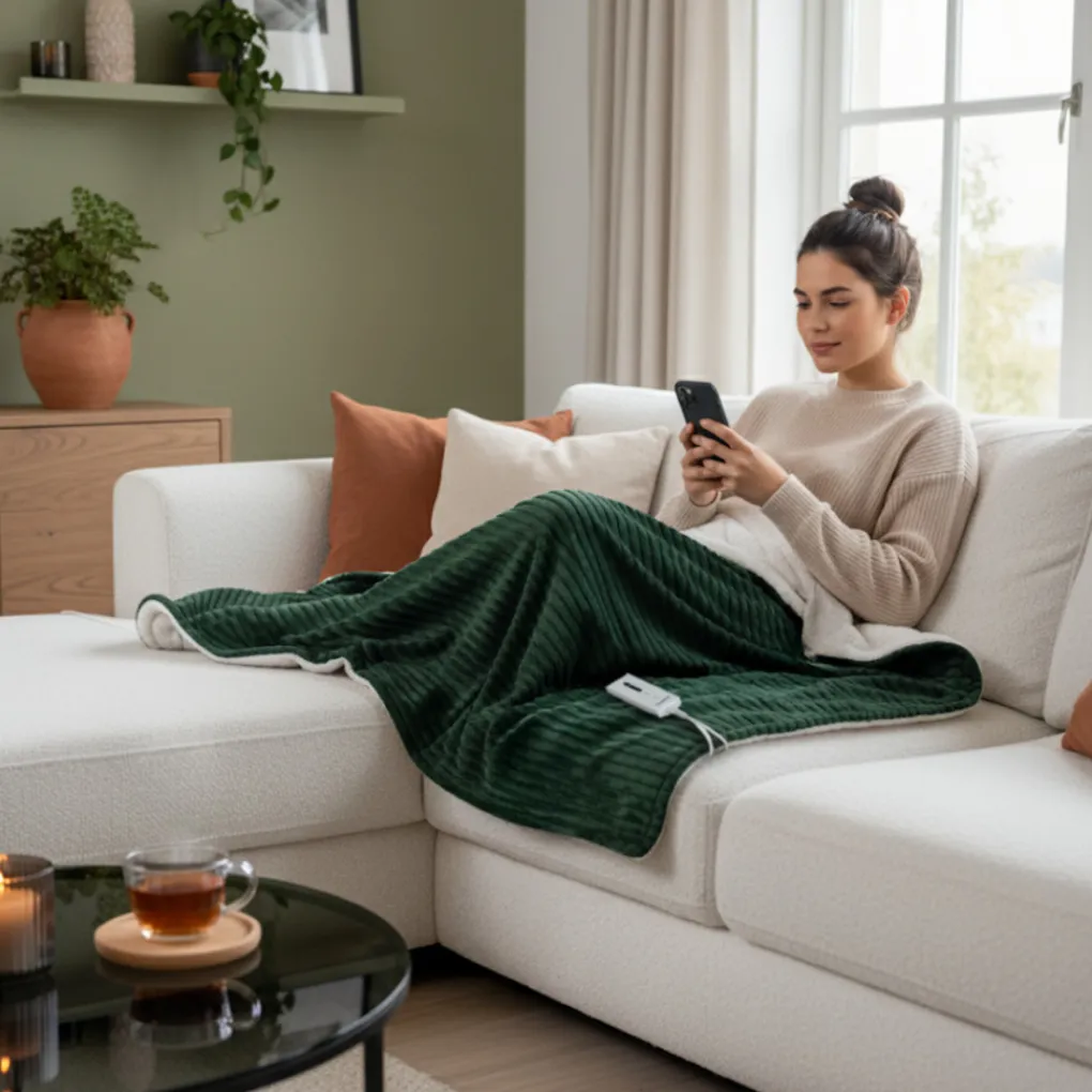 Geniet van ultiem comfort met de Tomado elektrische bovendeken TEB1804G. Deze groene omslagdeken heeft een heerlijk zachte fleece-wollige binnenkant die direct warmte en gezelligheid biedt. Met de verlichte schakelaar stel je moeiteloos een van de 5 warmtestanden in, ook wanneer het donker is. De warmtedeken warmt extra snel op en beschikt over een instelbare automatische uitschakeling tot 180 minuten. Dankzij de ingebouwde oververhittingsbeveiliging gebruik je hem altijd met een gerust hart. Het afneembare snoer maakt het mogelijk de deken in de wasmachine te wassen op maximaal 30°C. Wikkel hem om je heen of leg hem over je benen en ervaar het comfort.