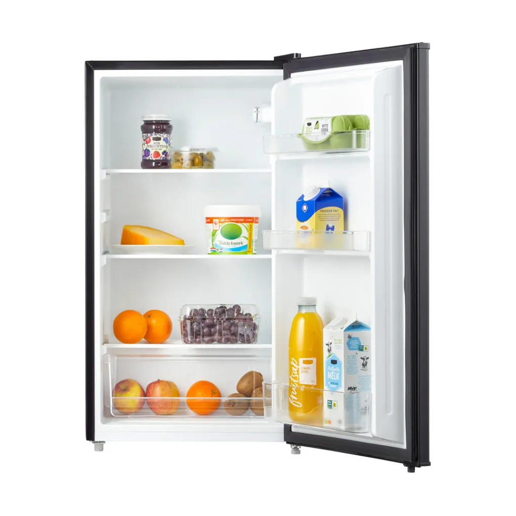 Deze tafelmodel koelkast heeft een netto inhoud 94 liter. Er zitten 3 glasplaten in waarvan er 2 verstelbaar zijn. Deze glasplaten hebben een speciaal gehard glas. Onderin de koelkast is er een groentelade te vinden waarmee je producten automatisch afgedekt worden.