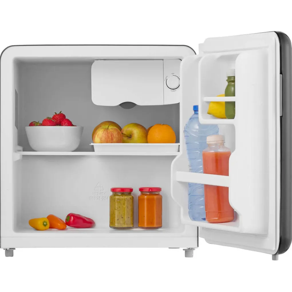 Deze vrijstaande Retro mini koelkast heeft een inhoud van 47 liter, waarmee je drankjes en kleine etenswaren koelt. Door zijn afmetingen is hij zeer geschikt voor kleine appartementen, kantoren, studenten- of hotelkamers. Aan de binnenkant van de mini koelkast vind je twee grote aparte vakken waar je van alles kunt koelen. Rechts bovenin zit een klein vak, dit is de lage temperatuurzone. In de deur zijn ook nog twee vakken te vinden waar bijvoorbeeld blikjes en een fles drinken gekoeld kunnen worden. Eén van de voordelen van deze mini koelkast is dat hij gemakkelijk op bijvoorbeeld een tafel, vriezer of bar geplaatst kan worden.