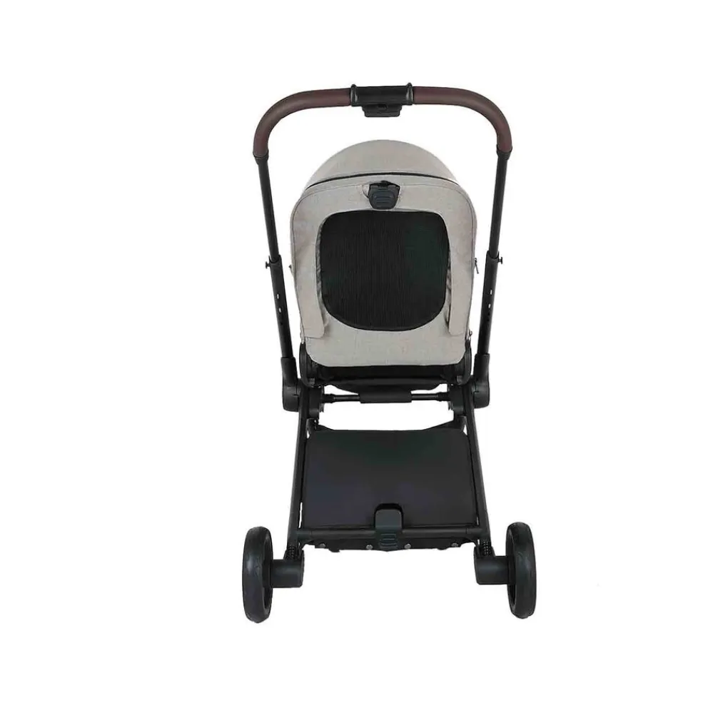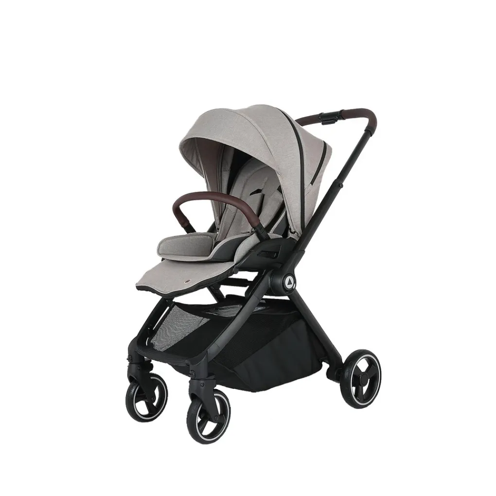 Het zwarte frame van lichtgewicht aluminium geeft de kinderwagen een moderne uitstraling. De duwstang en veiligheidsbeugel zijn afgewerkt met lederlook, waardoor de kinderwagen er niet alleen comfortabel uitziet maar ook luxe aanvoelt.