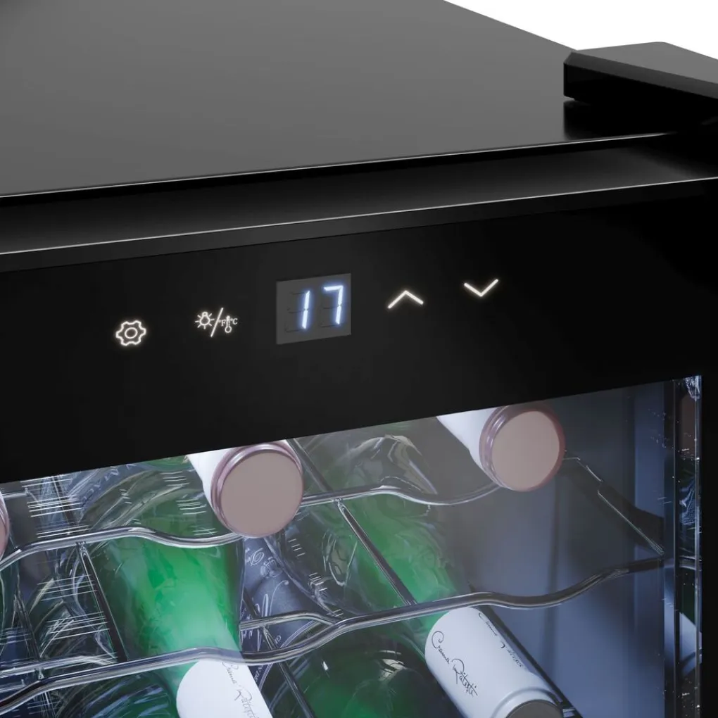 - Met een inhoud van 32 liter biedt de drankkoelkast ruimte voor 12 flessen