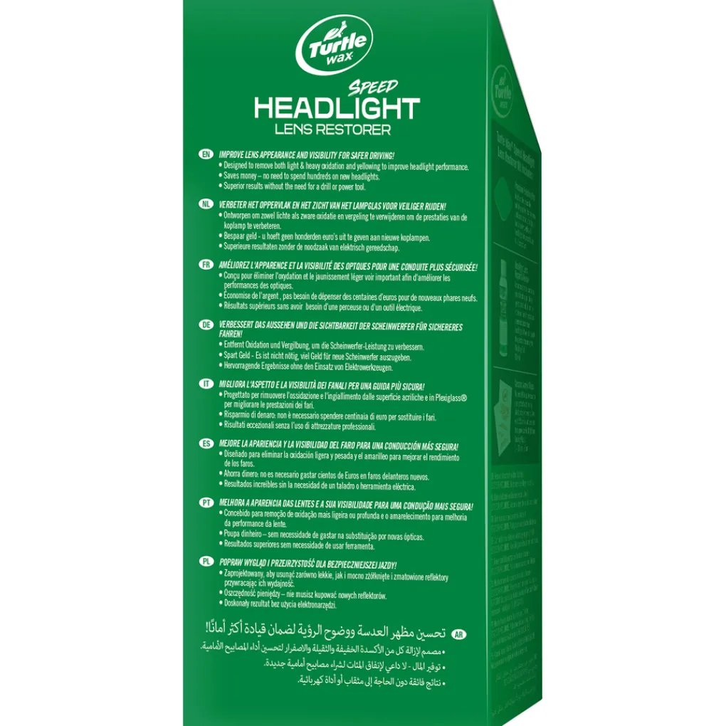 De nieuwste verbetering van de Turtle Wax Speed Headlight Lens Restorer Kit vermindert de inwerktijd of werkt 35% sneller met betere resultaten. De nieuwe kit bevat een sneller en beter reinigende Headlight Lens Repair & Renew Compound die vergeling en zandstrepen beter verwijdert en slechts 1 tweezijdige professionele Restoration Pad nodig heeft om hardnekkige plastic oxidatie te verwijderen.