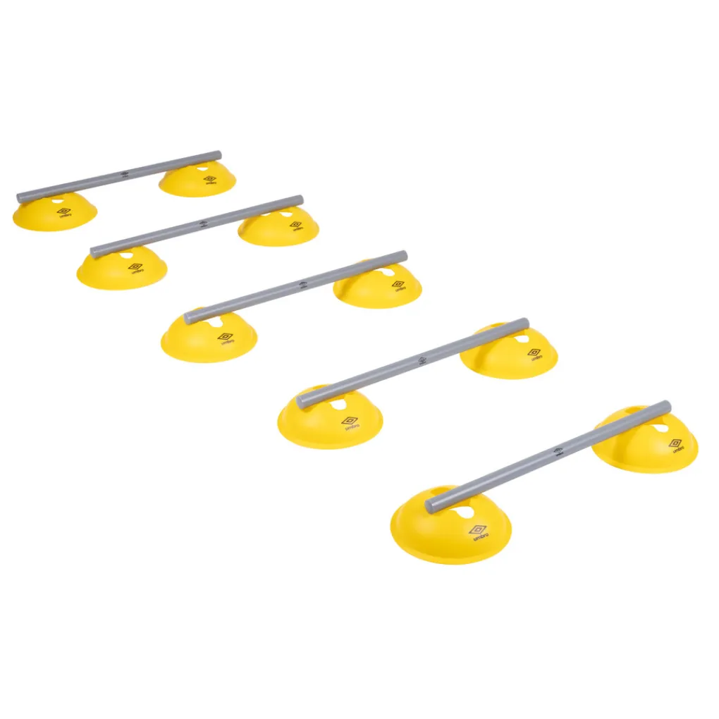 De Umbro hordenset bestaat uit 10 lage pionnen met een diameter van 20.5 centimeter en 5 dwarsstangen met een lengte van 54 centimeter. Hiermee kun je een tal van oefeningen uitvoeren die je helpen met het verbeteren van onder andere je algehele conditie, looptechnieken en coördinatie: perfect voor onder andere voetbaltraining en hardlopen. Loop recht over de horden heen met een enkele stap ertussen, of ga zijwaarts over de hordes heen om te werken aan looptechniek en coördinatie. Je kunt de Umbro hordenset daarnaast ook gebruiken voor verschillende schoolsporten en andere spelletjes. Gebruik de pionnen bijvoorbeeld als veldmarkering en de dwarsstangen tijdens gymnastiek oefeningen.