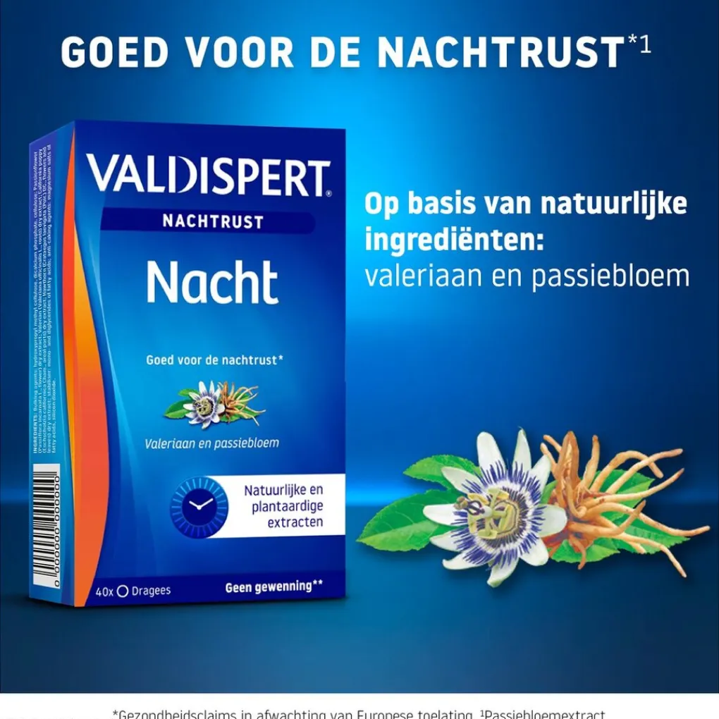 Valdispert Nacht Dragees zijn voor een goede nachtrust*. Valdispert Nacht is op basis van de natuurlijke ingrediënten valeriaanwortel en passiebloem. De formulering geeft geen gewenning.