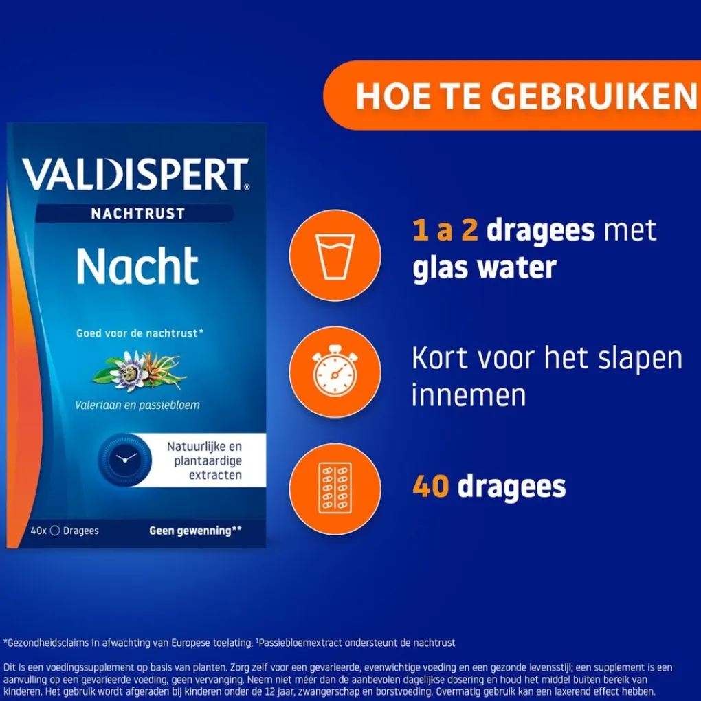 Neem 1 tot 2 dragees kort vóór het slapengaan in. De maximale aanbevolen dosering niet overschrijden. Slik de dragee(s) in z’n geheel door, bijvoorbeeld met water. Valdispert Nacht kan regelmatig en gedurende langere tijd gebruikt worden.