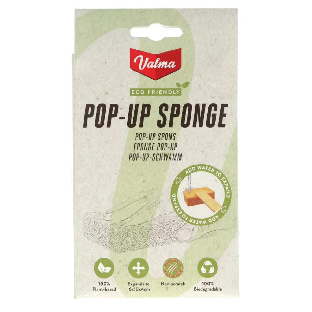 De Valma ECO Pop-Up spons is een 100% natuurlijke duurzame en herbruikbare cellulose spons. De unieke Pop-Up spons is samengeperst tot een zeer dun, plat schijfje met minimale afmetingen. Zodra de spons onder de kraan in contact komt met water, begint hij uit te zetten naar de ware grootte van circa: 16x10x4cm. De krasvrije Valma ECO spons heeft een hoog absorberend vermogen en is ideaal voor gebruik binnen- en buitenshuis voor bijvoorbeeld het wassen van de ramen of de auto. De spons voor en na gebruik grondig uitspoelen. Na gebruik droogt de spons hard op, voor opnieuw gebruik de spons onder de kraan houden en hij is weer klaar voor gebruik. De spons is 100% biologisch afbreekbaar. Na maanden of jaren gebruik kan deze dus gewoon gecomposteerd worden, zonder schadelijk gevolgen.
