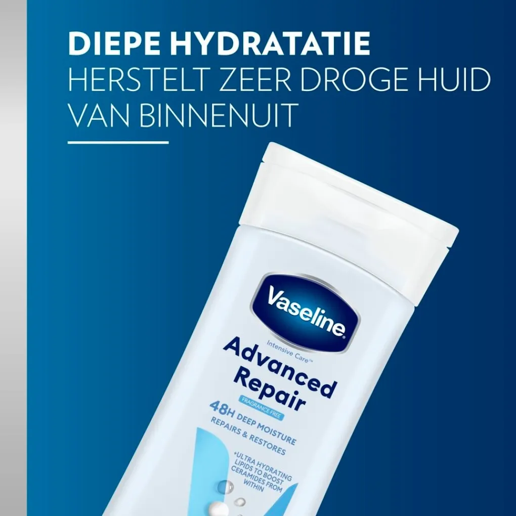 Vaseline Intensive Care Advanced Repair Bodylotion biedt tot 48 uur diepe hydratatie voor de zeer droge huid. Zelfs extreem droge plekjes worden weer zacht en glad. Bovendien is je huid daarna drie weken lang beschermd.