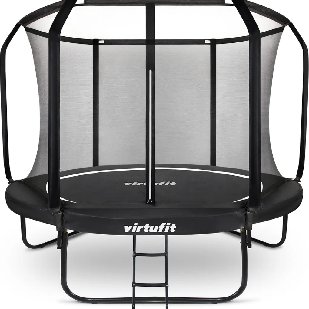 Trampoline met een modern designDe Virtufit Premium Trampoline is helemaal uitgevoerd in het zwart. Dit betekent dat ook het metalen frame, de trap en de buizen van het veiligheidsnet zijn meegespoten. Dit geeft de trampoline een moderne en strakke uitstraling. Een pronkstuk in je tuin.