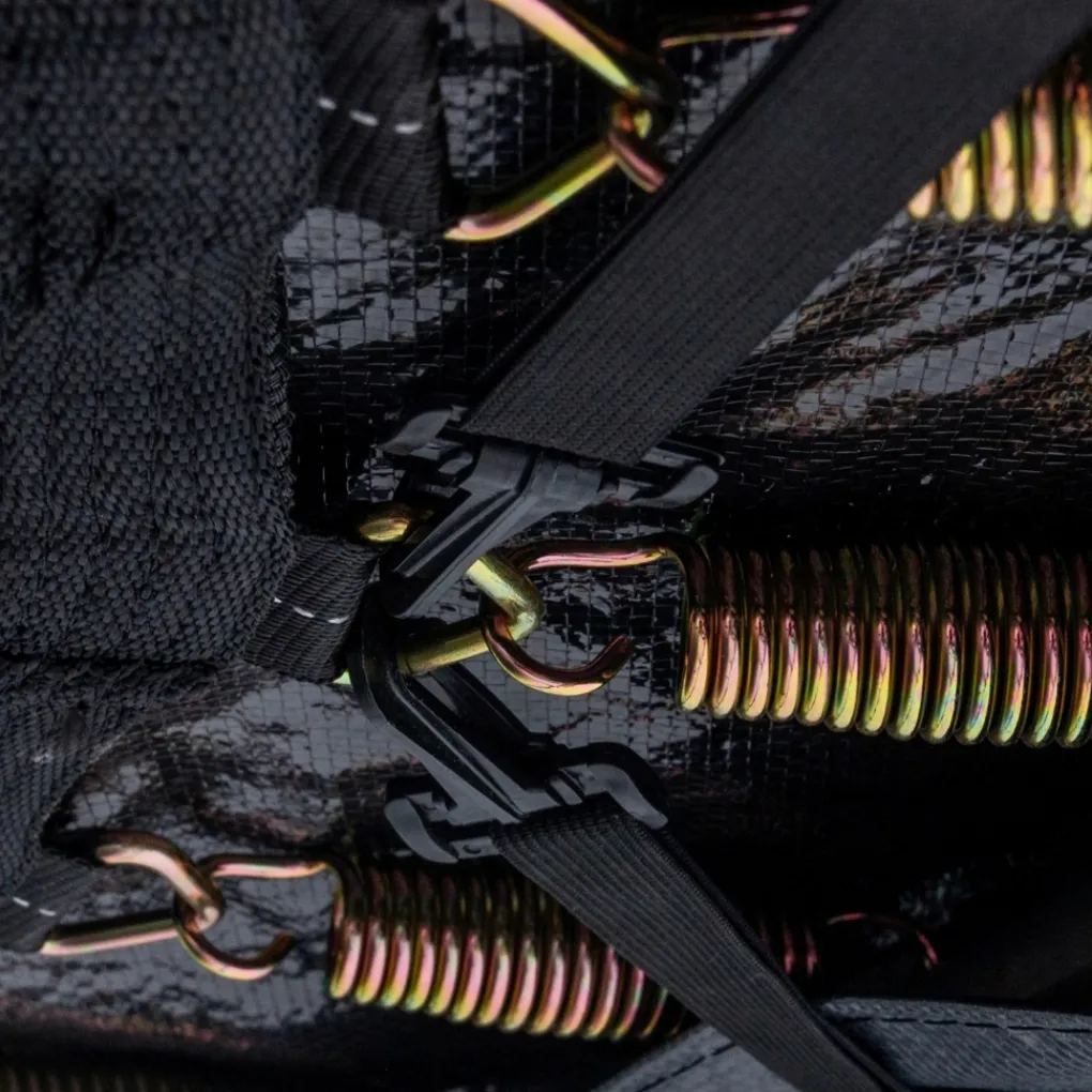 Voor maximale veiligheid heeft de trampoline een PVC veiligheidsrand met padding die zorgt voor extra demping bij een val of verkeerde sprong. Deze slijtvaste rand is 26 cm breed en 1,5 dik en heeft een zwarte kleur met groene details. Zowel de veiligheidsrand als het springvlak zijn water- en UV-bestendig.
