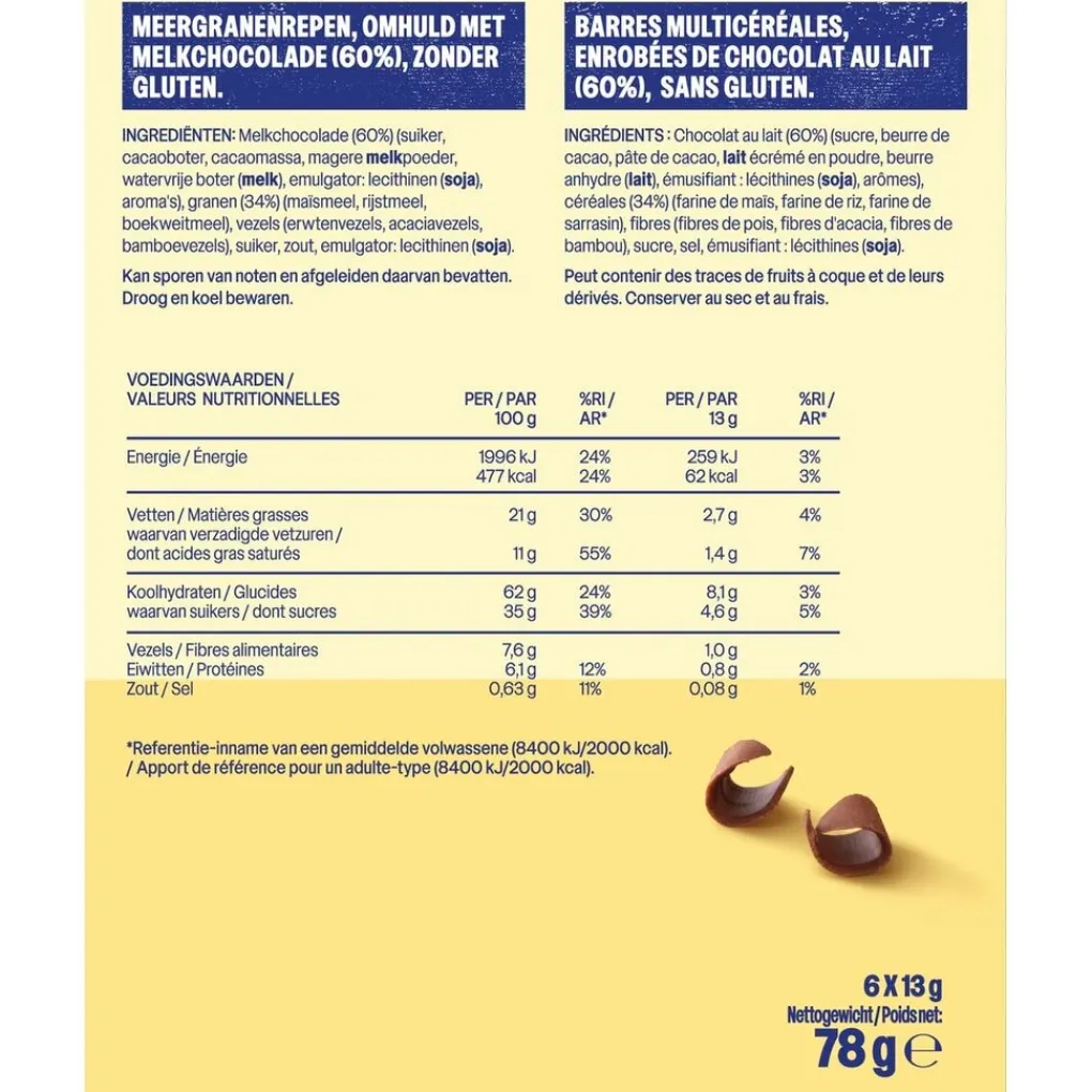 Ingrediënten: Melkchocolade (60%) (suiker, cacaoboter, cacaomassa, magere MELKpoeder, watervrije boter (MELK), emulgator: lecithinen (SOJA), aroma’s), granen (34%) (maïsmeel, rijstmeel, boekweitmeel), vezels (erwtenvezels, acaciavezels, bamboevezels), suiker, zout, emulgator: lecithinen (SOJA)