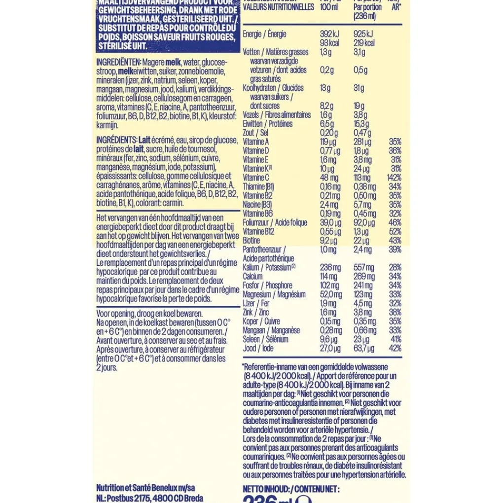 Maaltijdvervangend Product voor Gewichtsbeheersing, Drank met Rode Vruchtensmaak, Gesteriliseerd UHT.