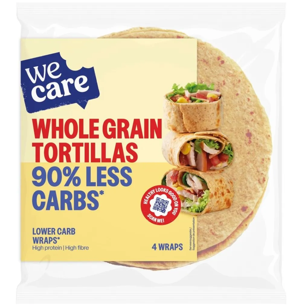 Ontdek de WeCare Whole Grain Tortillas Lower Carb Wraps met 90% minder koolhydraten dan gewone wraps en boordevol eiwitten en vezels. Ideaal als basis voor een gezonde lunch, avondmaaltijd of als tussendoortje.