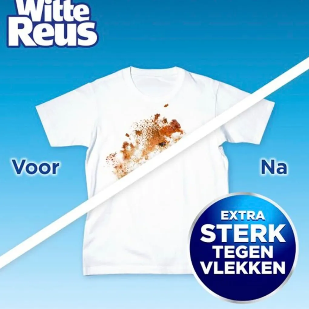 Witte Reus Waspoeder is geconcentreerd. Hierdoor hoef je per wasbeurt minder waspoeder te doseren voor de vertrouwde reuzenwaskracht. Daarbij is de formule actief in koud water.