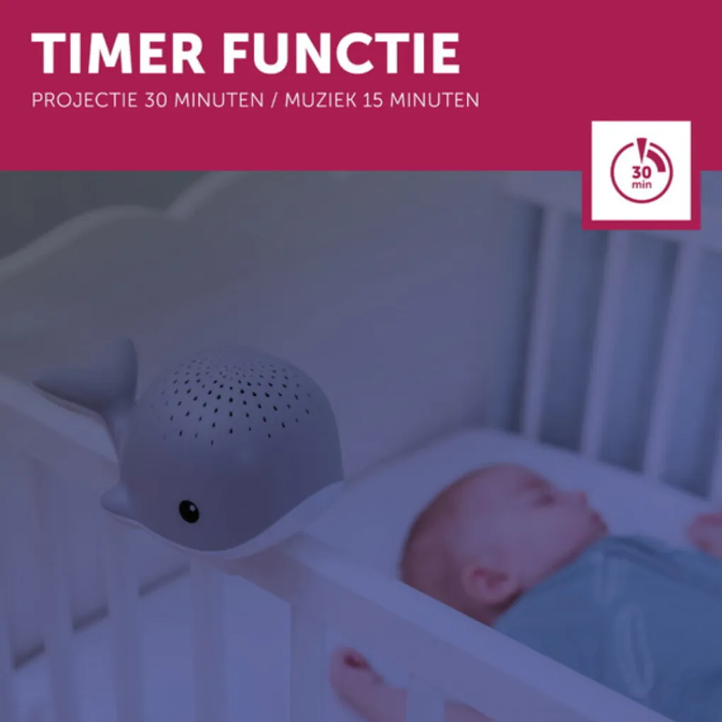 Wally projecteert waterdruppels in verschillende kleuren (blauw, groen, rood óf regenboogkleuren) tegen het plafond. Daarnaast speelt Wally drie verschillende melodieën, namelijk oceaan geluidjes, hartslag én slaapliedjes. Altijd een kleurtje en een geluidje dat bij jouw kindje past.