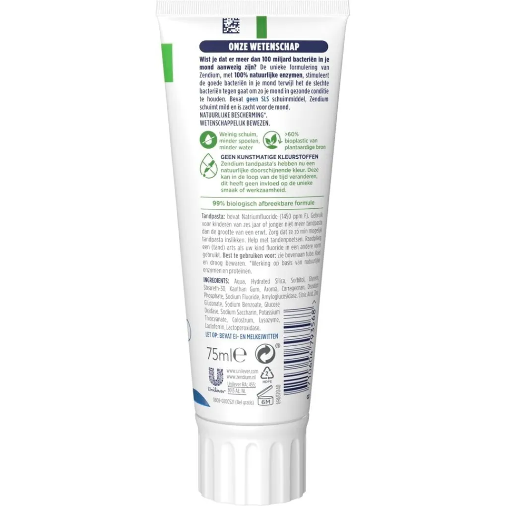 Zendium Classic Tandpasta bevat natuurlijke enzymen en proteïnen die de natuurlijke bescherming van je mond ondersteunen. Hij stimuleert goede bacteriën die je mond beschermen terwijl het de slechte* vermindert, en beschermt zo je mond op natuurlijke wijze.