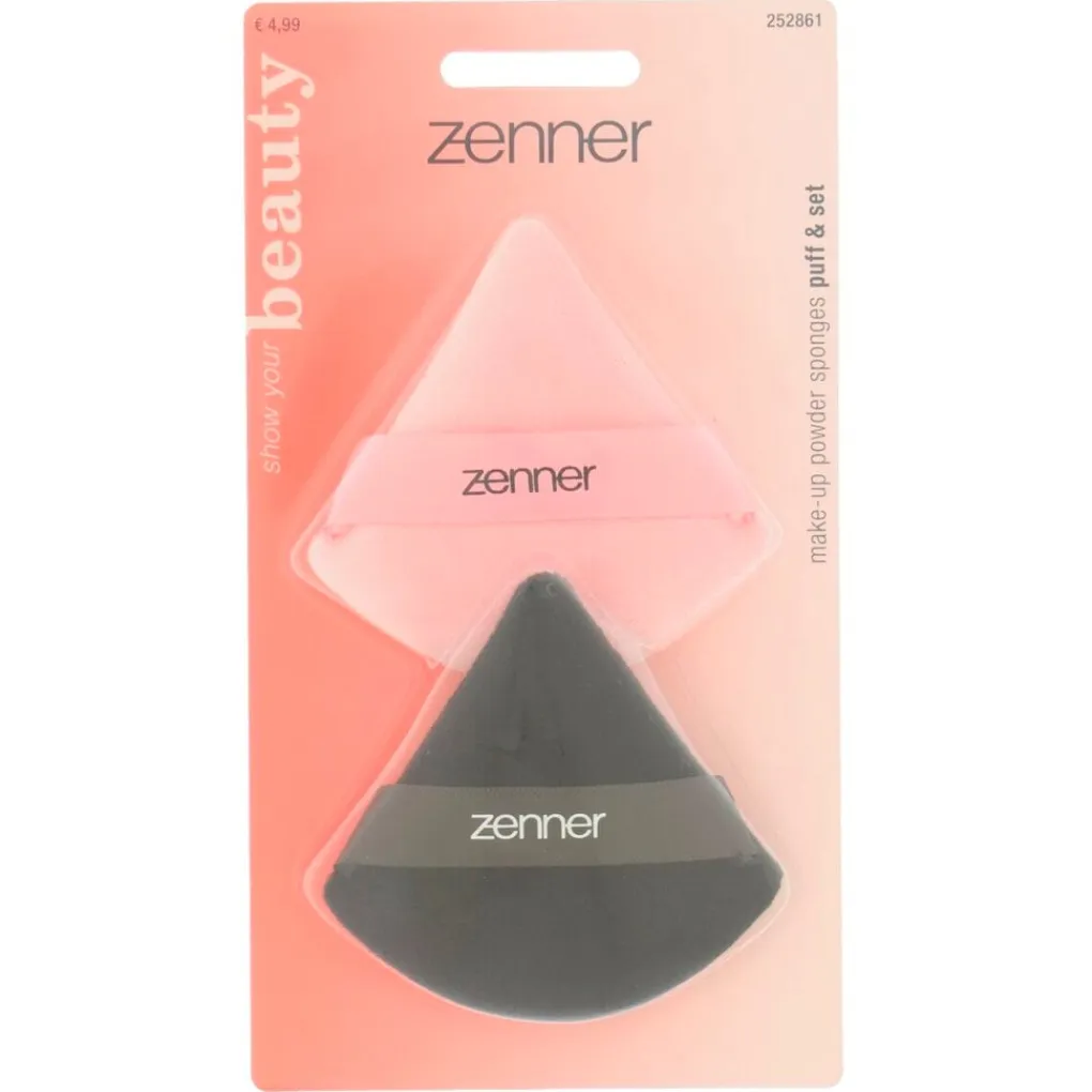 Breng poeder makkelijk en egaal aan met de Zenner Poedersponsjes. Verdeel de poeder eerst algemeen over je gezicht en gebruik daarna de puntige hoek om makkelijke kleinere gebieden nauwkeurig af te poederen, zoals rondom je neus. Dankzij het lusje kun je de spons goed vasthouden en ga je nog nauwkeuriger te werk. Beide sponzen zijn dubbelzijdig te gebruiken.
