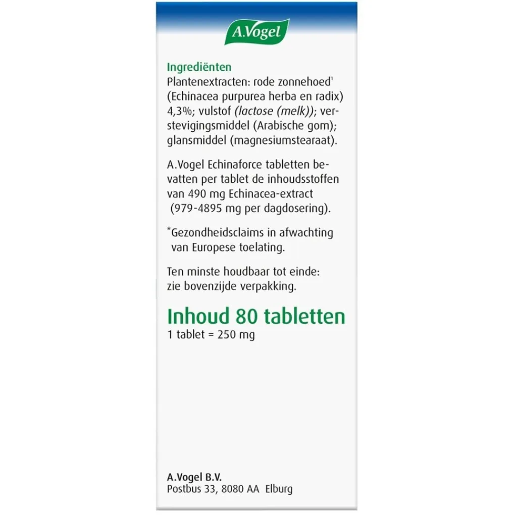 Samenstelling: A.Vogel Echinaforce tabletten bevatten per tablet de inhoudsstoffen van 490 mg Echinacea-extract (979-4895 mg per dagdosering).