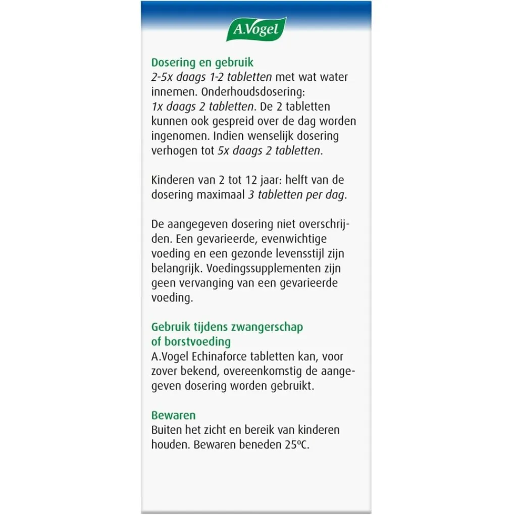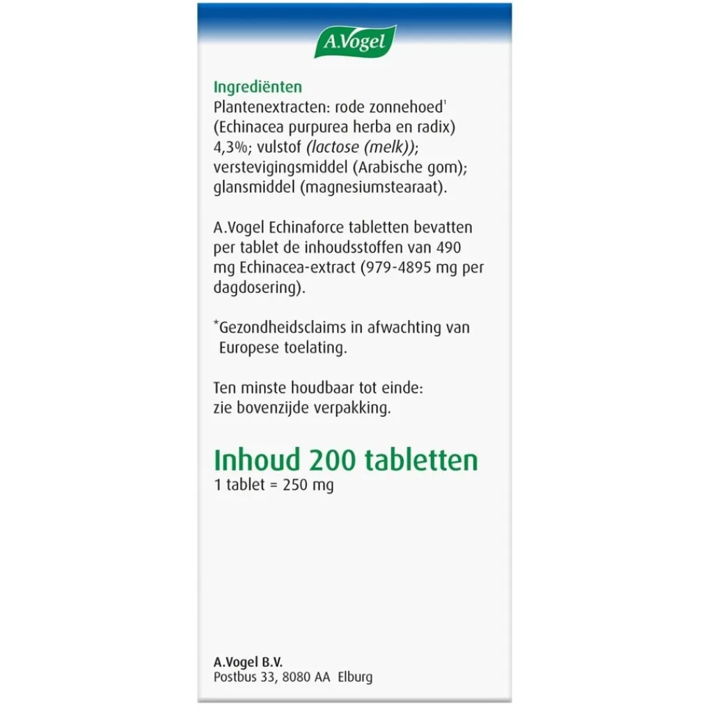 Samenstelling: A.Vogel Echinaforce tabletten bevatten per tablet de inhoudsstoffen van 490 mg Echinacea-extract (979-4895 mg per dagdosering).