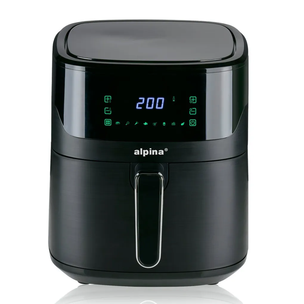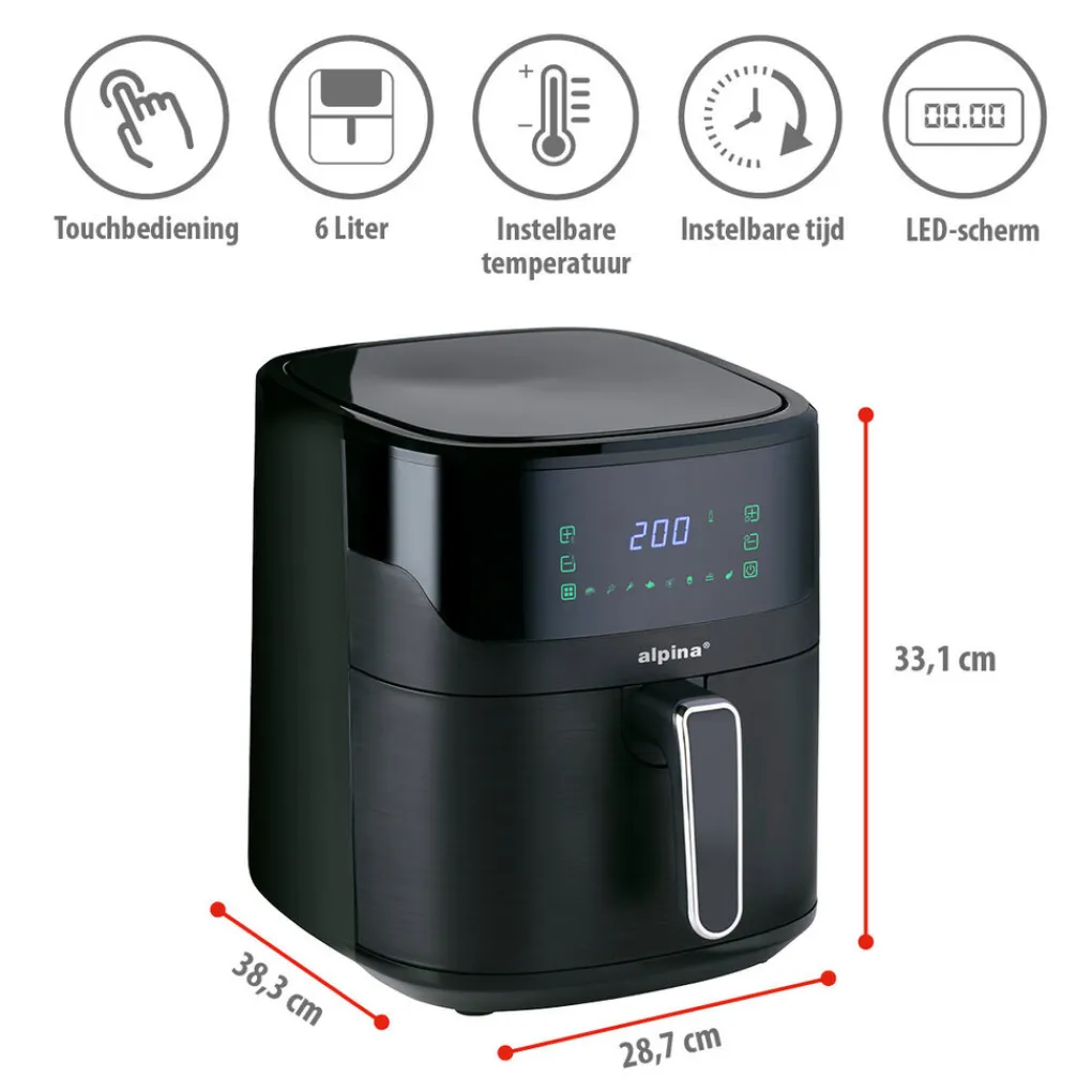 De airfryer beschikt over een antiaanbaklaag. Na gebruik kun je de mand gemakkelijk uit de heteluchtfriteuse halen om deze vervolgens met de hand af te wassen.Specificaties alpina airfryer 6L