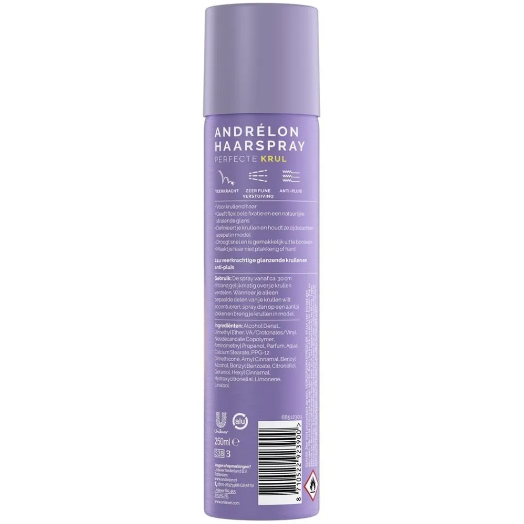 Andrélon Perfecte Krul Haarspray geeft flexibele fixatie en glans aan krullend haar. Je krullen blijven soepel in model en pluizen niet.
