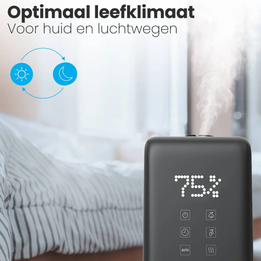 Verbeterde luchtkwaliteit Met de luchtbevochtiger van Auronic gaat de luchtvochtigheid in de ruimte omhoog. Hierdoor geniet je van een optimale luchtkwaliteit. De fijne nevel verspreidt zich evenredig door de ruimte. Door onze humidifier kun je beter en rustiger ademen, zo slaap je rustiger en zorg je voor een comfortabele leefomgeving.