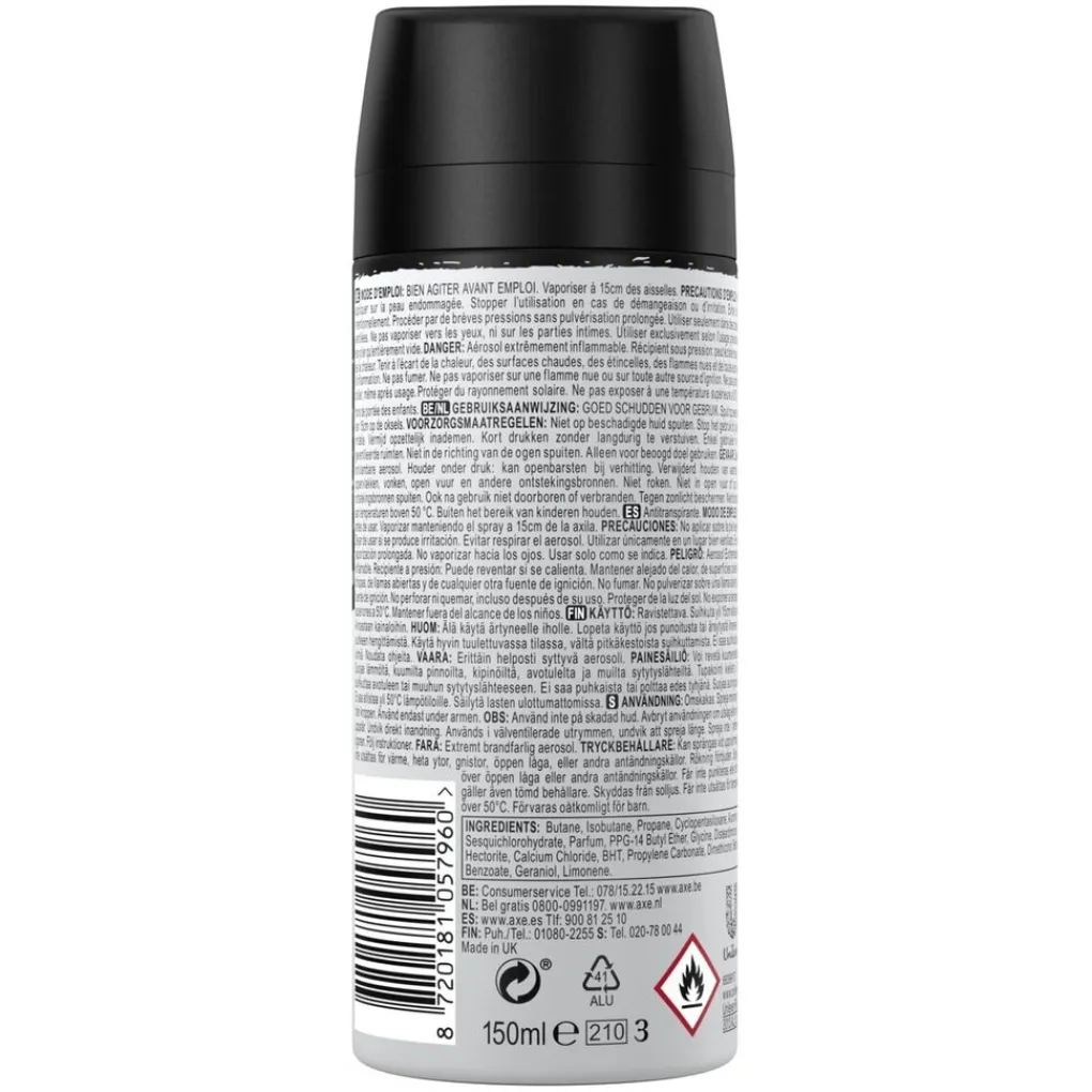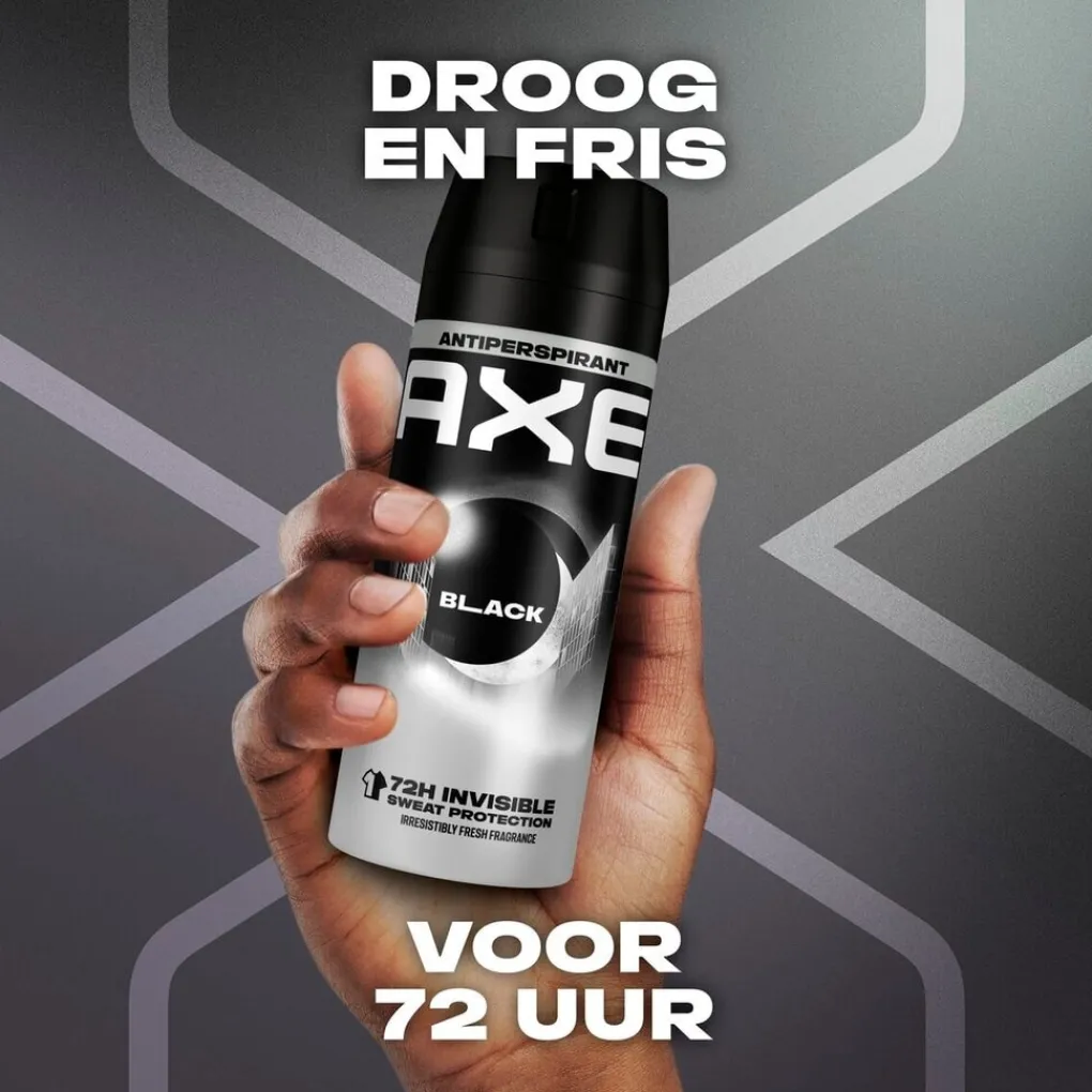 Axe Black Antitranspirant Spray garandeert langdurig droge oksels. Dus het maakt niet uit wie er op je pad komt, je kunt gerust zijn in de wetenschap dat je er 100% klaar voor bent. Bovendien krijg je die stimulerende geur met frisse citroen, een vleugje munt, ceder en sandelhout waardoor je frisser bent, de hele dag door.