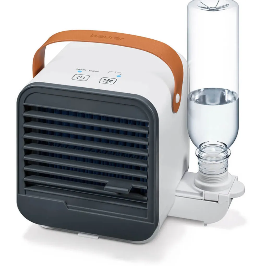 Beurer LV 50 Fresh tafelventilator/luchtkoeler. Deze compacte aircooler brengt verkoeling en bevochtiging van de lucht met behulp van een ventilator en een verdampingsprincipe. Door zijn kleine formaat en coole uiterlijk is hij uitermate geschikt voor op tafel of op je werkplek.