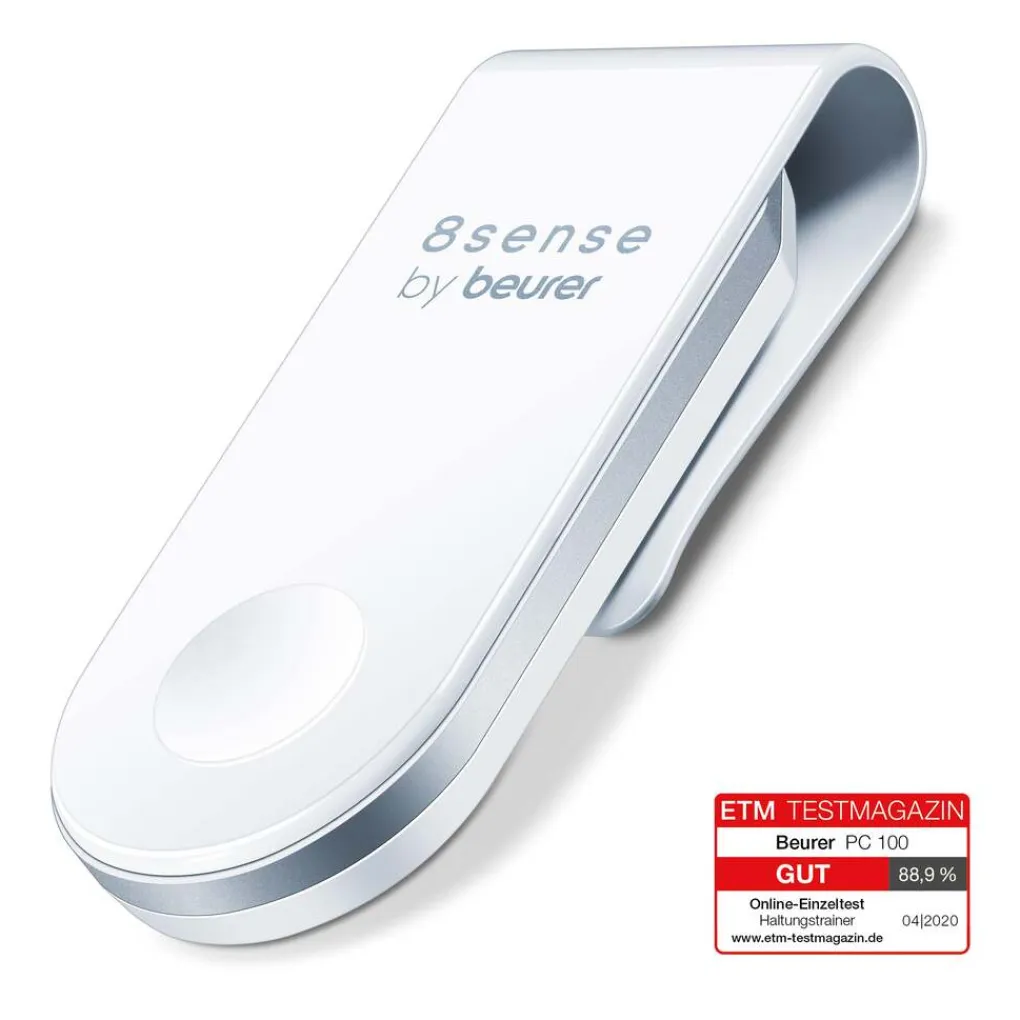 Bevestig de PC100 aan je kleding in je nek en koppel het met Bluetooth aan je smartphone met de 8 sense-app. Deze geeft een zachte trilling bij te lang in een houding zitten en kan 14 dagen je houding registreren. De “8sense” app is handig en maakt je bewust van je (foute) zithouding.