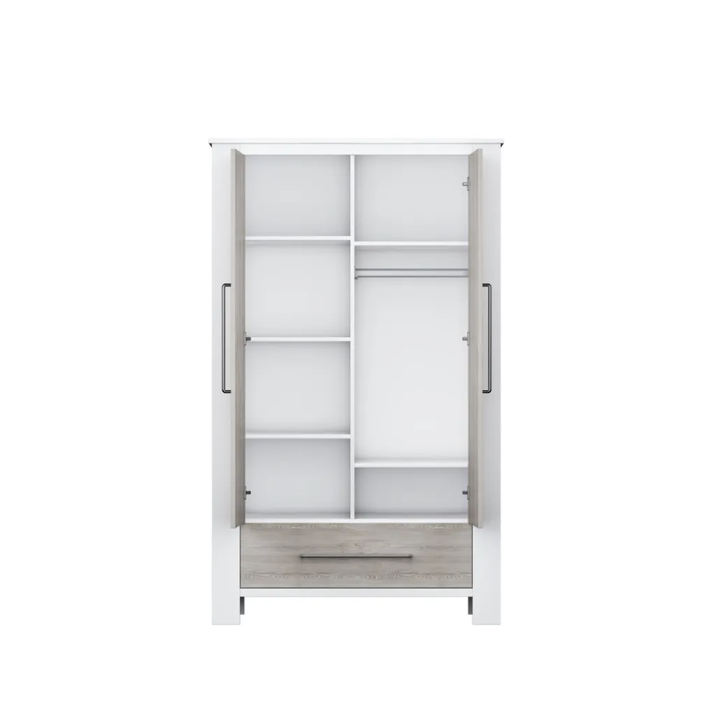 Met twee ruime deuren en een handige lade biedt de Born Lucky Kledingkast Noël volop opbergruimte voor kleding en accessoires. Achter de deuren vind je zowel een hang- als leggedeelte, ideaal om alles georganiseerd en overzichtelijk op te bergen. De extra opberglade biedt een perfecte plek voor kleinere items zoals dekentjes of schoenen. Deze praktische indeling maakt het een veelzijdige keuze voor de inrichting van de babykamer.