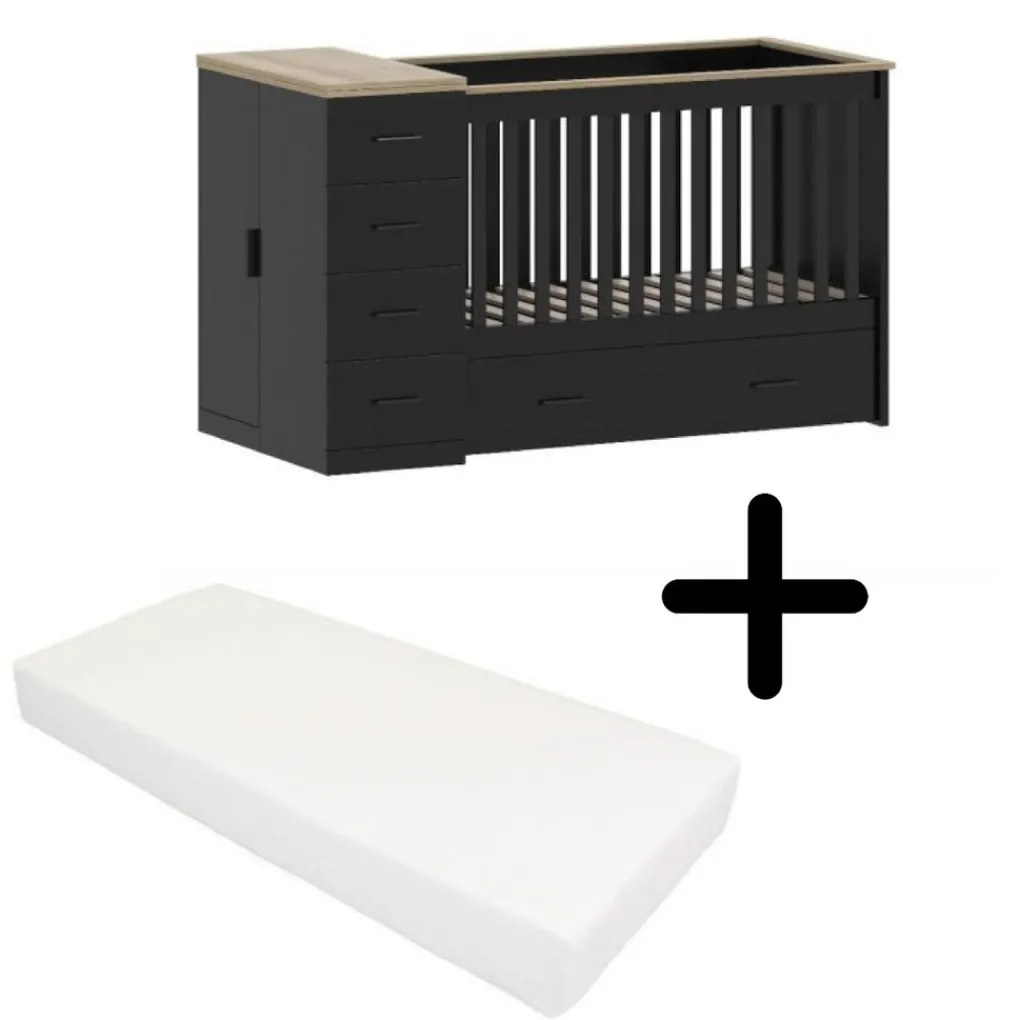 Born Lucky Combi Ledikant Memphis Zwart Eiken is een tijdloos en elegant meubel. Zwart raakt niet snel uit de mode en past in veel verschillende interieurstijlen. Het zwarte meubel is afgewerkt met een eikenhouten rand en commodeblad. Een eyecatcher voor in de babykamer!