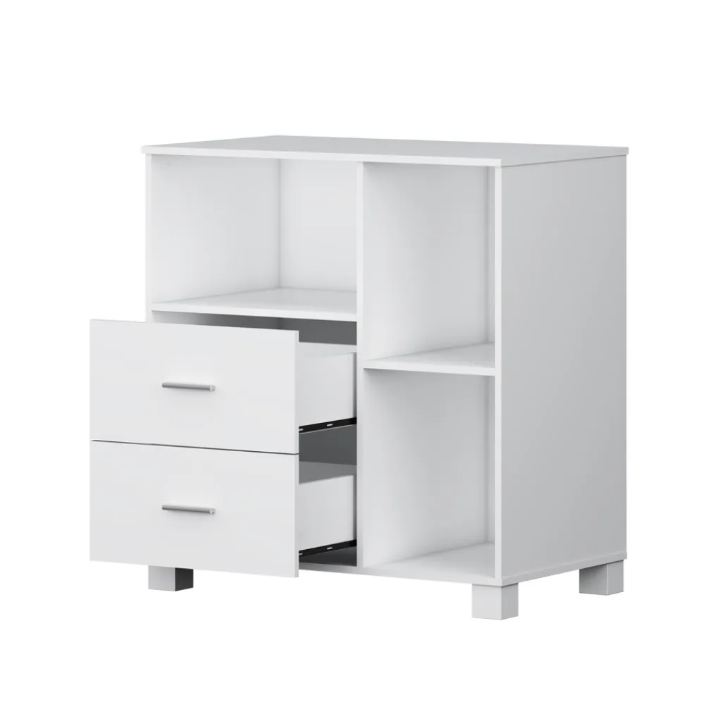 De twee ruime lades bieden voldoende ruimte voor het opbergen van luiers, kleding, hydrofiel doeken en verzoringsproducten. In de open vakken kan een commodemandje worden gezet of accessoires: praktisch en decoratief! Alles wat je dagelijks nodig hebt tijdens het verzorgen van je kindje heb je altijd binnen handbereik.