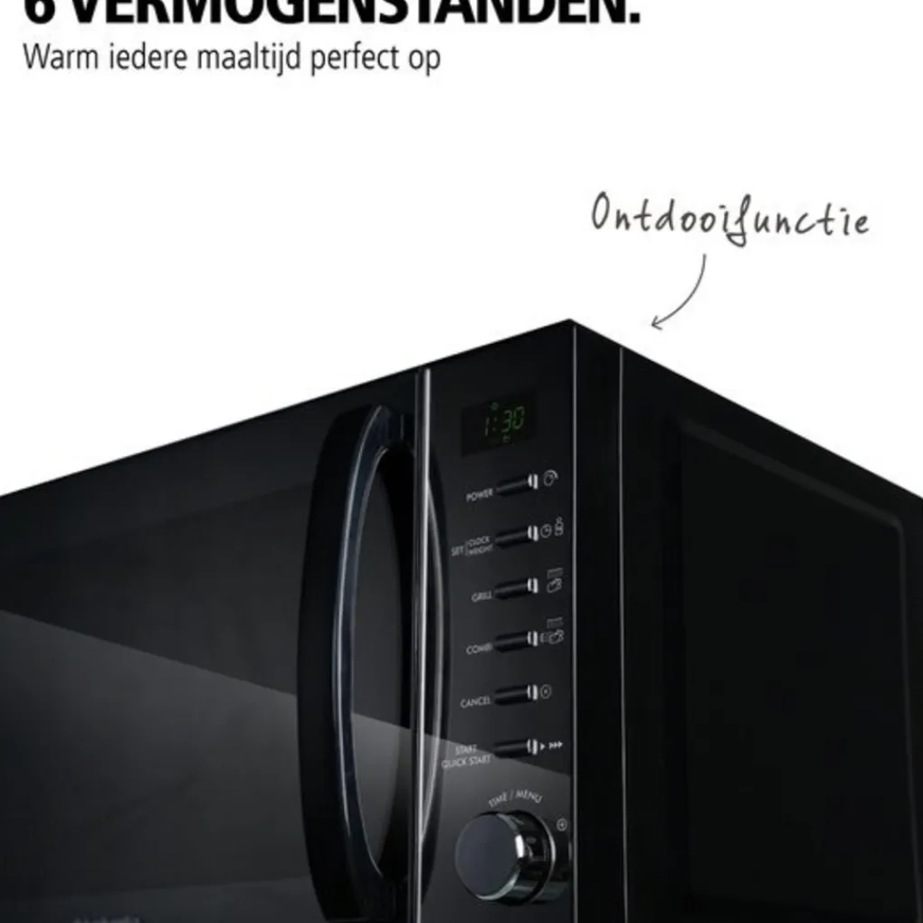 De combimagnetron heeft een vermogen van 700 watt en 6 vermogenstanden, welke handmatig te verstellen zijn en zorgen dat jouw eten in een mum van tijd perfect opgewarmd of ontdooid is. Daarnaast beschikt de magnetron over 13 automatische kookprogramma’s, waardoor je niet hoeft na te denken over het vermogen en de tijd tijdens het verwarmen. Deze programma’s zijn onder andere voor het opwarmen van eten en het maken van soep, pizza, popcorn en verschillende gegrilde vlees- en visgerechten. In de handleiding van de magnetron staat precies uitgelegd wat alle standen zijn en wat de hoeveelheden zijn waarvoor deze standen perfect zijn.