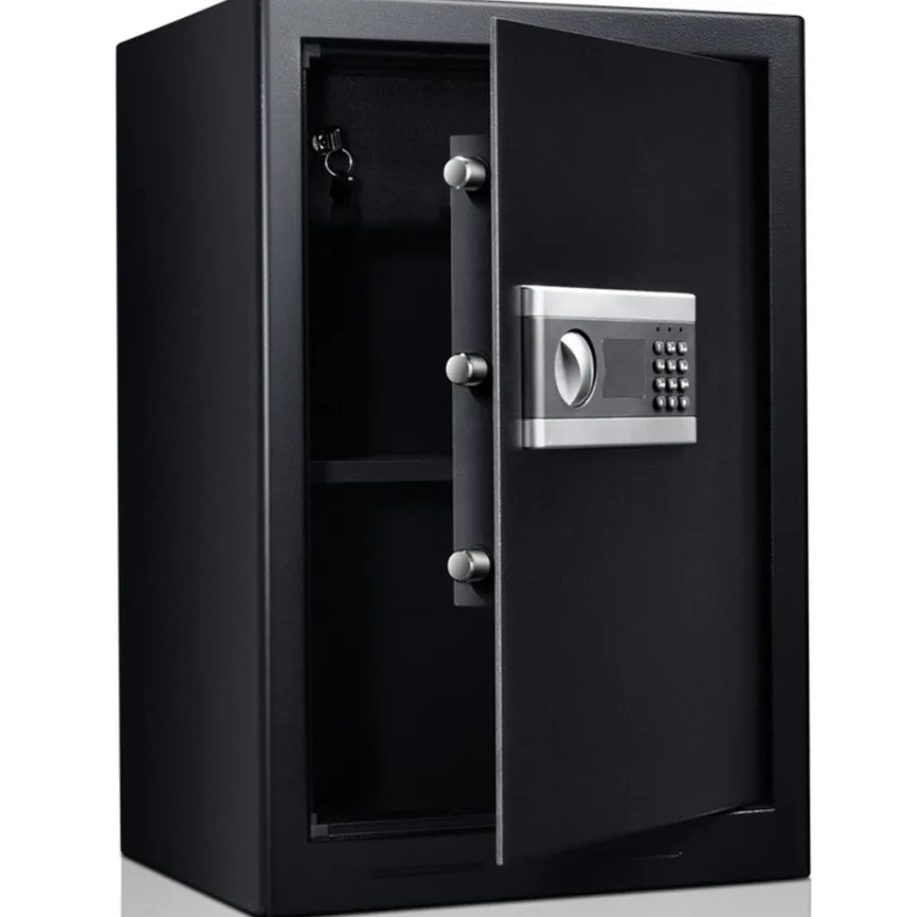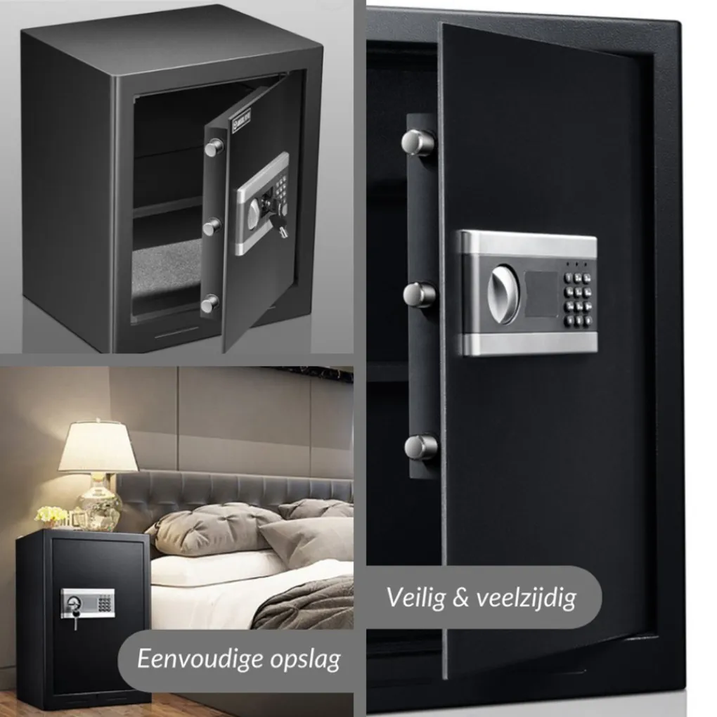 Het digitale codeslot van de kluis is batterij aangedreven waardoor je geen rekening hoeft te houden met het aansluiten op het lichtnetwerk. Als de batterijen op raken gaan het indicator lichtje rood branden. Daarnaast zijn er 2 sleutels aanwezig voor het geval de code wordt vergeten of de batterijen te weinig stroom levert. De kluis heeft een bescheiden simpele look, valt niet op en sluit aan op velen soorten interieur door de neutrale zwarte kleur.