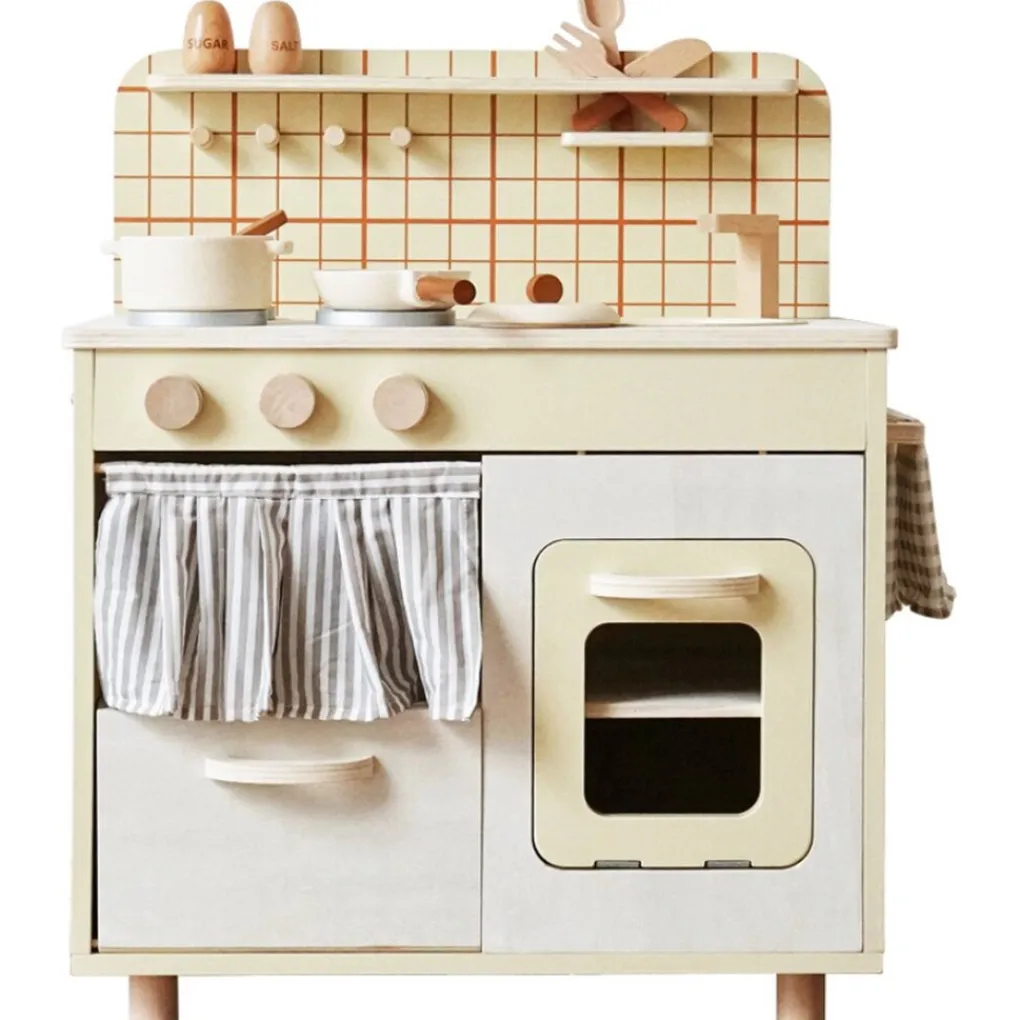 Naast zijn functionele waarde voegt de speelkeuken ook een vleugje charme toe aan de speelkamer of kinderkamer. De natuurlijke houten afwerking en het stijlvolle ontwerp passen goed bij diverse interieurstijlen en maken de kamer van uw kind compleet.