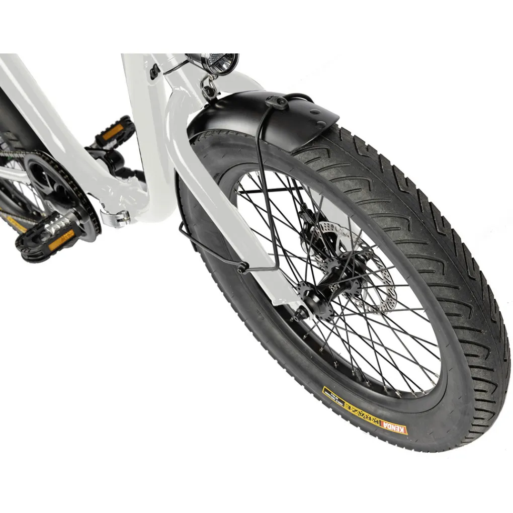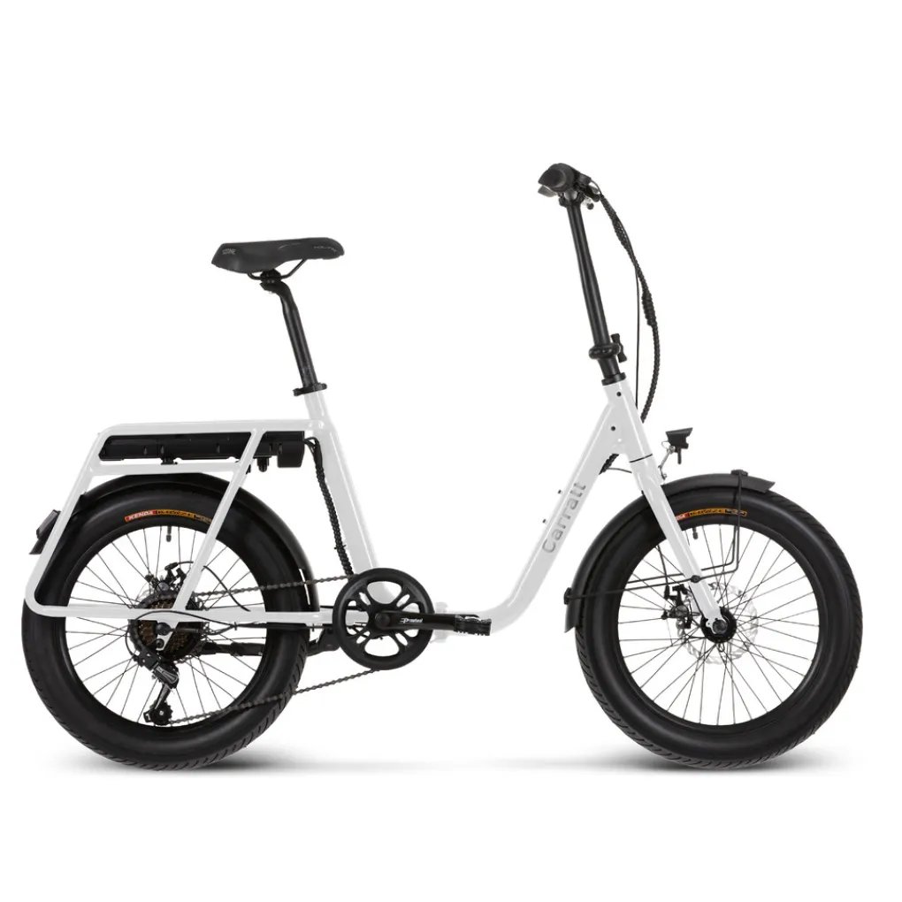 Het stalen vouwframe met lage instap en aangelaste stevige bagagedrager en vaste voorvork is voorzien van twee 20 inch wielen met dikke, 3 inch brede banden. De Bafang motor is in het achterwiel gemonteerd waar die aan het oog wordt onttrokken door de 7 versnellingen derailleur en de schijfrem. Deze opvallende verschijning in glanzend zwarte afwerking laat u met minimale inspanning tegen de wind in fietsen, een duintje op of af en ook met een behoorlijke last op de drager blijft het rijden een genot. De ondersteuning werkt mee tot u een snelheid van 25 km/u hebt bereikt. De 10.4 Ah accu heeft veel uithoudingsvermogen waardoor u flinke ritten kunt maken met de Carratt Bari. In noodgevallen kunt u de fiets ook zonder ondersteuning gewoon blijven gebruiken, maar dan zullen de verder comfortabele dikke banden voor merkbare rolweerstand zorgen.