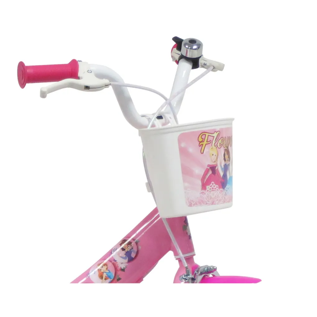 Dit vrolijk gekleurde kinderfietsje is een stevig en veilig product,geschikt voor kinderen vanaf ca 5 jaar. Het stabiele frame,de 16 inch spaakwielen met massieve luchtbandjes,calliperremmen op zowel het voorwiel als het achterwiel,spatbordjes,een bel en afneembare zijwieltjes maken dit leuke model een ideaal fietsje waarmee het kind spelenderwijs leert rijden,sturen en stoppen. De ketting is keurig opgesloten in de kettingkast. In het mandje aan het stuur kan een koekje voor onderweg worden meegenomen,terwijl de pop mee kan in het zitje achterop. Dit fietsje is niet bedoeld om mee deel te nemen in het echte verkeer,er zit bijvoorbeeld geen verlichting op. Maar op eigen terrein,de stoep,het schoolplein en bij voorkeur onder toezicht van een oplettende volwassene kan het kind de beginselen van het fietsen onder de knie krijgen. Voor het kind zullen de lieve kleuren en mooie prinsessenplaatjes het meest aanspreken,terwijl het al rondrijdend de wereld om zich heen ontdekt en vergroot.
