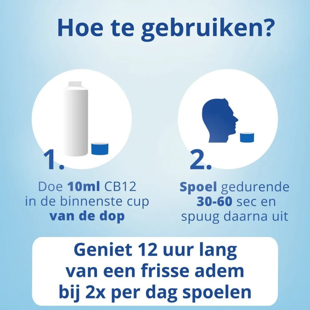 Het CB12 Original Mondwater bestrijdt de oorzaak van een slechte adem. CB12 werkt direct en zorgt twaalf uur lang voor een frisse adem. Daarnaast is het mondwater alcoholvrij en heeft het een aangename muntsmaak.
