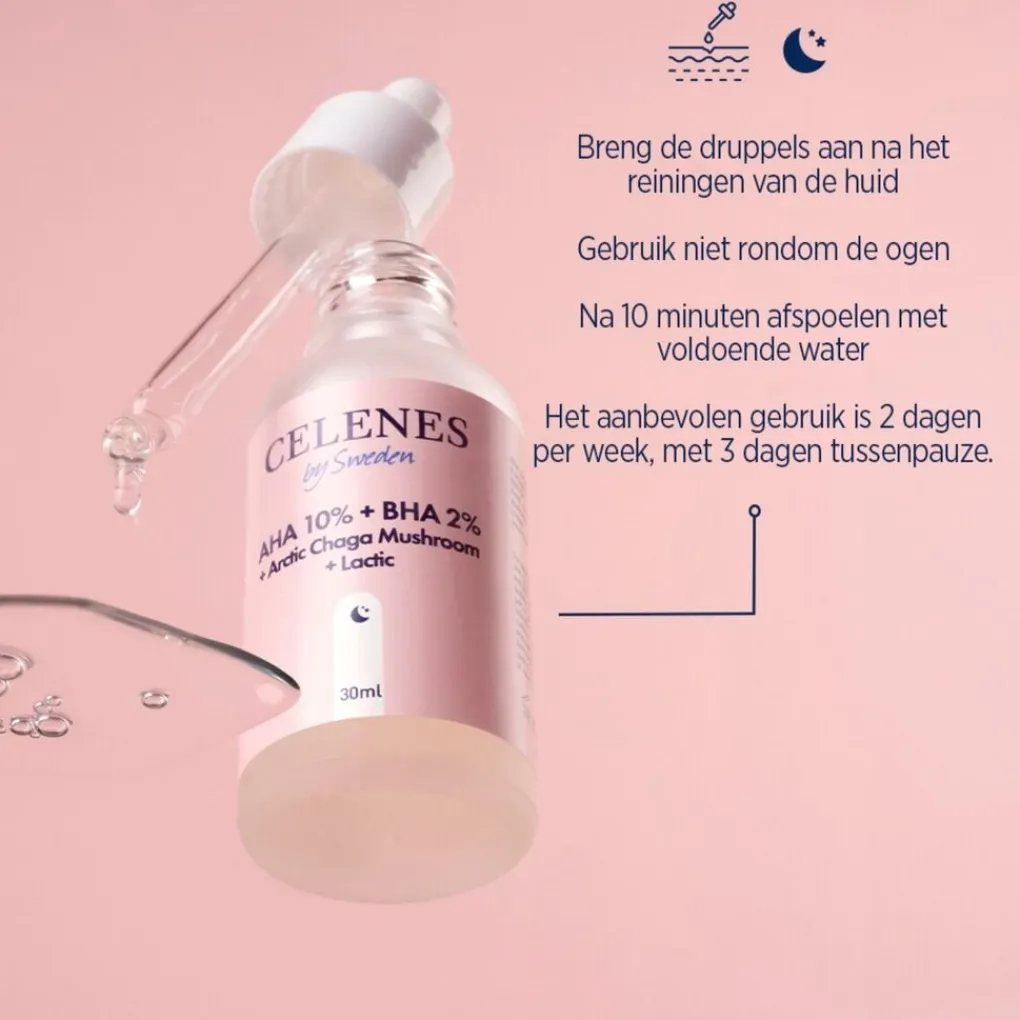 AHA 10% + BHA 2% + Arctic Chaga Mushroom + Lactic. Alle Huidtypen