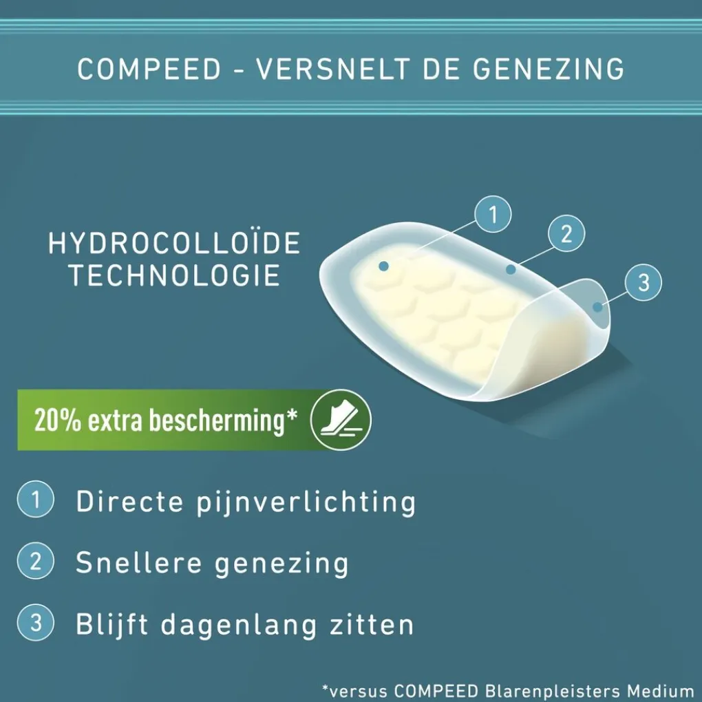 • Blijft goed plakken en heeft ultra dunne, schuin aflopende randen, zodat Compeed meebeweegt en meerdere dagen blijft zitten.