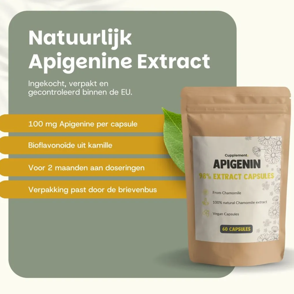 Apigenin (apigenine) is een natuurlijk bioflavonoïde dat van nature voorkomt in onder andere kamille (Matricaria chamomilla) Deze plantaardige verbinding staat bekend om zijn zuivere oorsprong en veelzijdige werking 🌼 100 mg hoogwaardig Apigenin✔️extract per capsule – puur en krachtig 🌿 Natuurlijk gewonnen uit kamille, zonder onnodige toevoegingen 💊 In plantaardige capsules – volledig geschikt voor veganisten ✨ Populaire keuze binnen natuurlijke supplementen vanwege de brede inzetbaarheid
