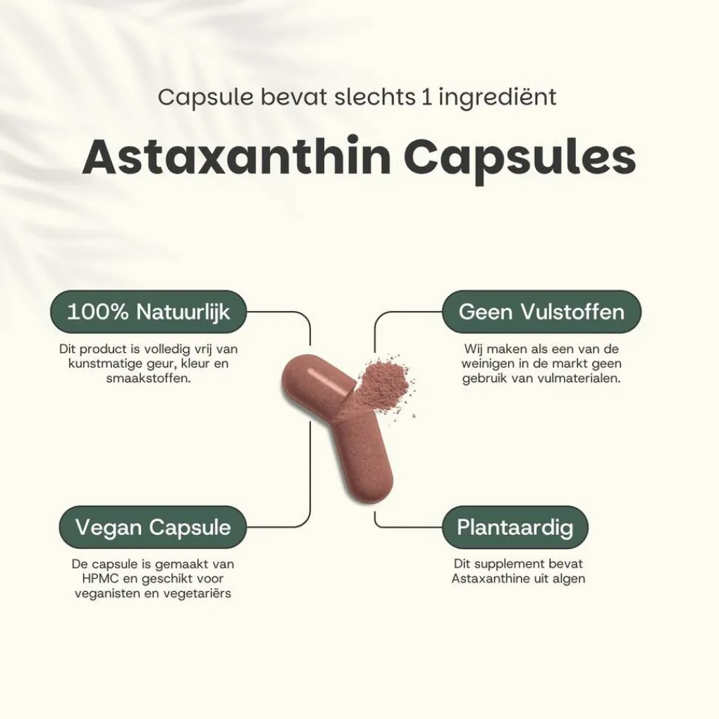 Astaxanthine Capsules zijn krachtige antioxidanten die van nature voorkomen in microalgen, vooral Haematococcus pluvialis. Dit rode pigment staat bekend om zijn sterke werking tegen vrije radicalen en ondersteunt zo het behoud van een gezonde huid, ogen en algemene vitaliteit ⚡ Sterke dosering per capsule – optimaal voor dagelijks gebruik 🌿 Natuurlijk afkomstig van microalgen, zonder toevoegingen 💊 Handige capsules – makkelijk in te nemen en mild voor de maag 🌱 Geschikt voor vegetariërs en veganisten, volledig plantaardig en puur