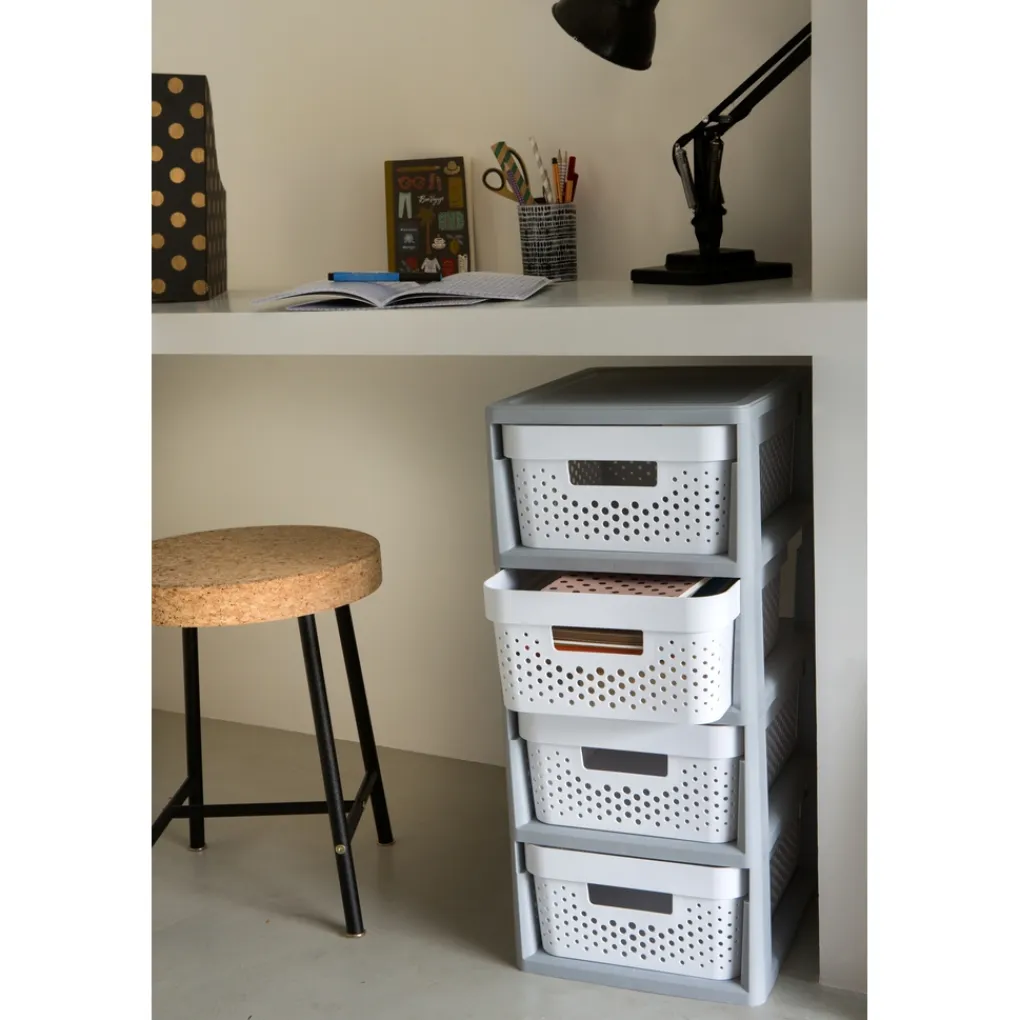 Geef elke ruimte een rustige, georganiseerde uitstraling met een Curver Infinity Ladesysteem. Dankzij het tijdloze, Scandinavische design en de praktische indeling met 4 lades van 11L creëer je in een handomdraai overzicht in badkamer, slaapkamer, woonkamer of kantoor. Licht, duurzaam en eenvoudig te verplaatsen: dit is slimme opslag die meebeweegt met jouw dagelijkse routine.