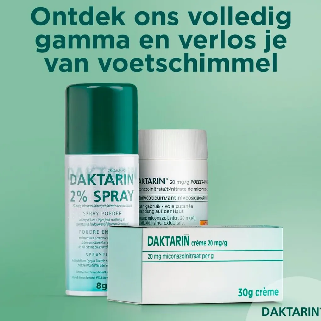 Daktarin Miconazolnitraat 20mg/g Strooipoeder bij Schimmelinfecties is voor de behandeling van huidinfecties op je handen, voeten en huidplooien. Het bevat miconazolnitraat.
