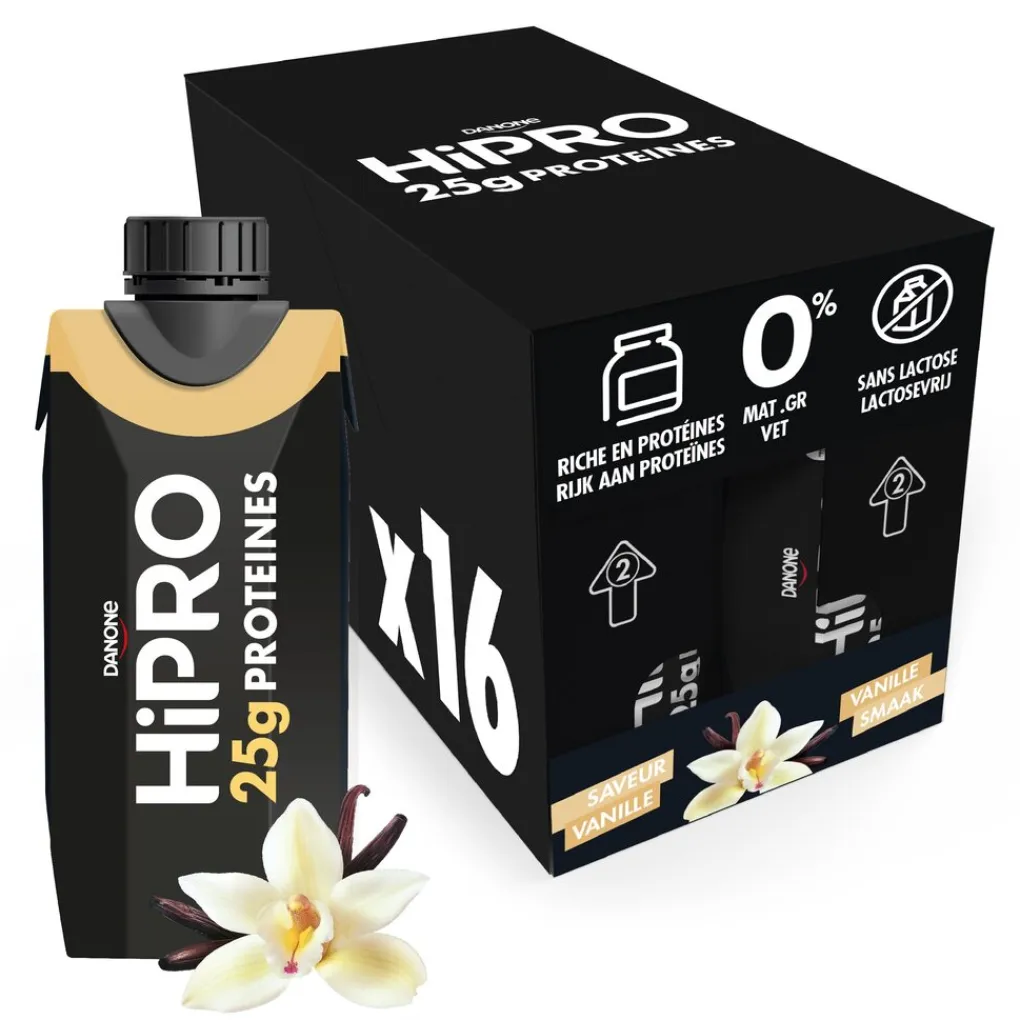 Danone HiPRO Protein Drink – Chocoladesmaak en Vanillesmaak, de perfecte keuze voor iedereen die op zoek is naar heerlijke proteïnedranken. Danone HiPro Protein Drink staat symbool voor deze voortdurende toewijding en brengt je proteïnedranken van hoge kwaliteit in heerlijke chocolade- en vanillesmaken. Of je nu van chocolade of vanille houdt, er is een smaak die bij je past. Beide smaken zijn verkrijgbaar in handige verpakkingen van 330 ml. Bovendien zijn beide smaken ook afzonderlijk verkrijgbaar zodat je van je favoriete smaak kunt genieten zonder steeds aparte flesjes te moeten kopen. Je kunt kiezen uit verpakkingen van 8, 16 of 24 brikjes, afhankelijk van je behoeften en voorraadniveaus. Met deze optie kun je gemakkelijk je voorraad eiwitshakes aanvullen en genieten van het gemak en de voordelen van Danone HiPro Protein Drink. Elke portie Danone HiPro Protein Drink bevat 25g proteïne, met alle 9 essentiële aminozuren en 5000mg BCAA’s, wat ideaal is voor fitnessliefhebbers en atleten. Het is ook vetarm, suikerarm en lactosevrij, waardoor het ideaal is voor mensen met verschillende dieetbehoeften. Kies voor de Danone HiPro proteïnedrank en geniet van de heerlijke smaken, de handige verpakking en de mogelijkheid om in bulk te kopen. Belangrijkste kenmerken van Danone HiPRO • 25 g eiwit per portie • 5000 mg BCAA • 9 essentiële aminozuren • 0% vet • Zonder lactose Gebruik HiPRO ambient to drink kan buiten de koelkast worden bewaard (en desgewenst in de koelkast) en begeleidt je bij al je sportieve avonturen! HiPRO ambient to drink kan buiten de koelkast worden bewaard (en desgewenst in de koelkast) en begeleidt je bij al je sportieve avonturen!