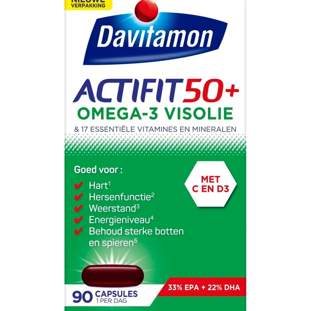 Davitamon Actifit 50+ Omega-3 Visolie Multivitamine & Mineralen Capsules zijn een dagelijkse aanvulling van vitaminen en mineralen, aangevuld met omega 3-visolie, speciaal ontwikkeld voor volwassenen vanaf 50 jaar.