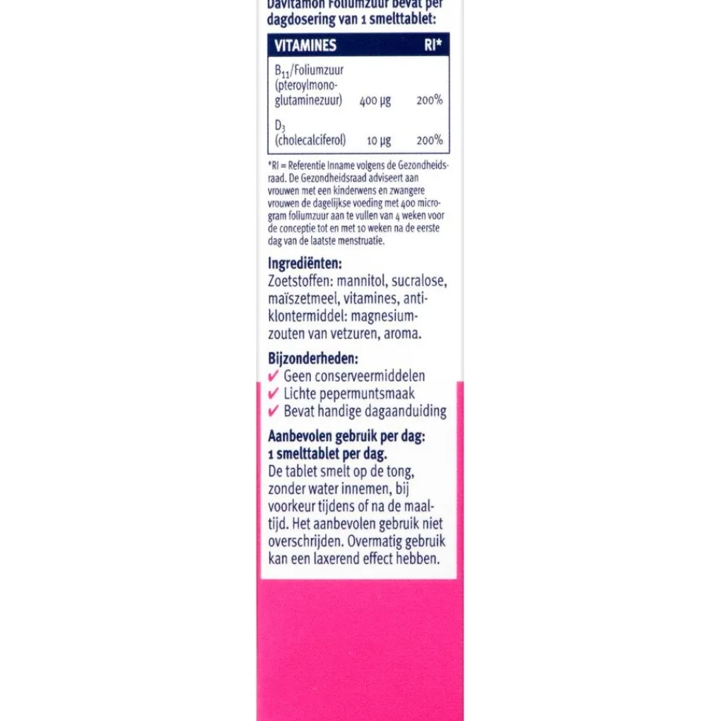 In het verdere verloop van de zwangerschap blijft de behoefte aan foliumzuur verhoogd ter ondersteuning van de ontwikkeling van de baby en om bij te dragen aan de vorming van de placenta en de rode bloedcellen. Wanneer je zwanger bent adviseert de Gezondheidsraad om naast de normale voeding dagelijks 10 microgram extra vitamine D in te nemen. De blister bevat een handige dagaanduiding waardoor het vergeten van een smelttablet niet snel zal voorkomen.