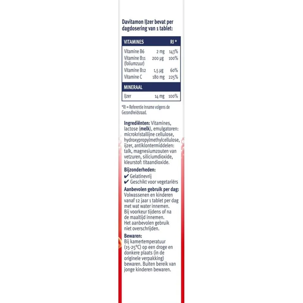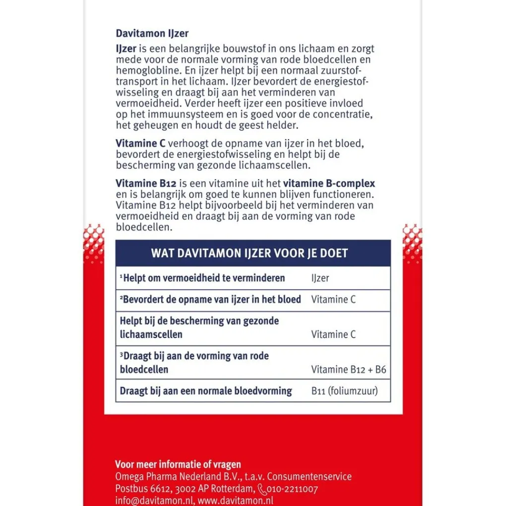 Davitamon IJzer met Vitamine C en B12 Tabletten zijn goed voor de vermindering van vermoeidheid (ijzer), dragen bij tot verbetering van ijzeropname (vitamine C) en de vorming van rode bloedcellen (vitamine B12).