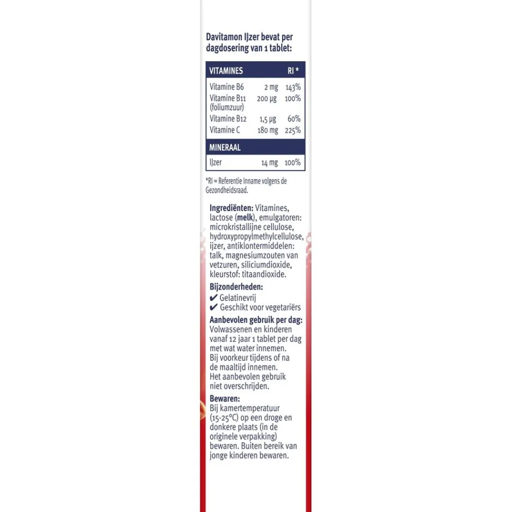 Ingrediënten: Vitamines, verstevigingsmiddel: microkristallijne cellulose, lactose (MELK), ijzer, glansmiddel: hydroxypropylmethylcellulose, antiklontermiddelen: magnesiumzouten van vetzuren, siliciumdioxide, kleurstof: calciumcarbonaat, stabilisator: glycerol.